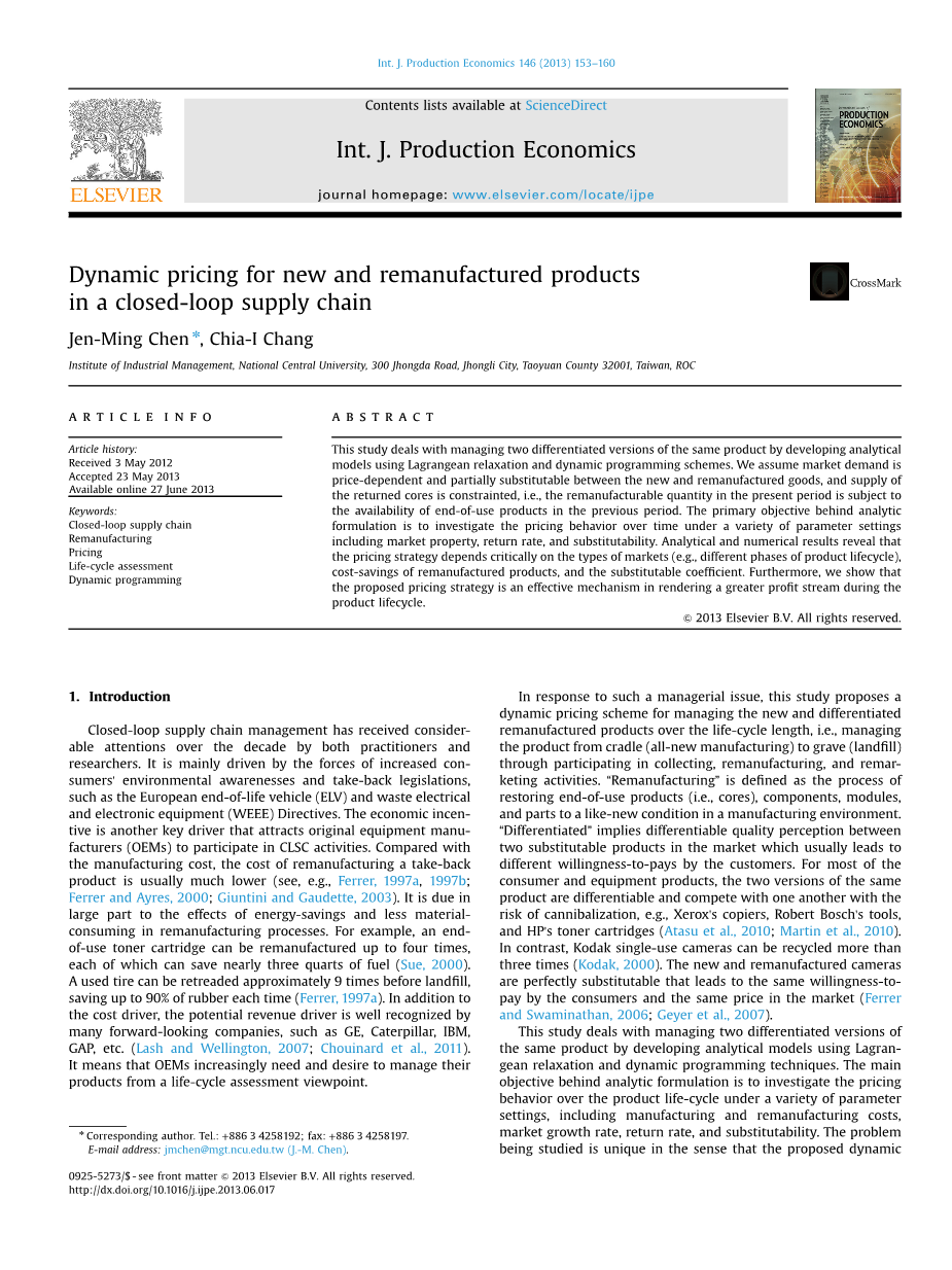 文献来源Jen-Ming Chen , Chia-I Chang,2013. Dynamic pricing for new and remanufactured products in a closed-loop supply chain. Int. J. Production Economics 146 (2013) 153–160.