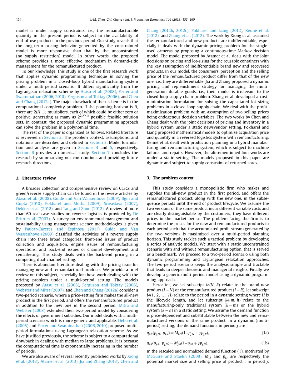 有大量的文献研究了有关新产品的和再制造产品定价问题的处理。我们再次做了一个简短的回顾,特别是针对在一个多周期环境下的定价问题的工作处理。Atasu等(2008), Ferguson 和Toktay (2006), Webster 和 Mitra (2007), 陈和张(2012a)等人建立的模型考虑了一二期的情况,设定价格的公司在第一期制造全新的产品,在第二期除了提供新产品外还提供再制造产品。Mitra和Webster (2008)在考虑了政府补贴的影响下扩展了他们的两期模型。我们的模型适用于多期情况下的研究。Debo 等(2005)、 Ferrer 和 Swaminathan (2006, 2010)使用拉格朗日松弛算法提出了多阶段的配方。正如我们之前所说的理由,该计划存在计算方面的缺点,在处理中的中位数是个大问题。这是因为周期数的计算时间是呈指数增长的。