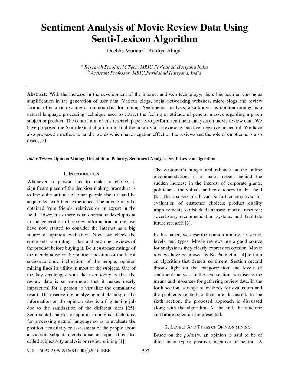 本文介绍了在Twitter中使用的电影评论情感分析Senti-lexicon算法。 意见的主要目的