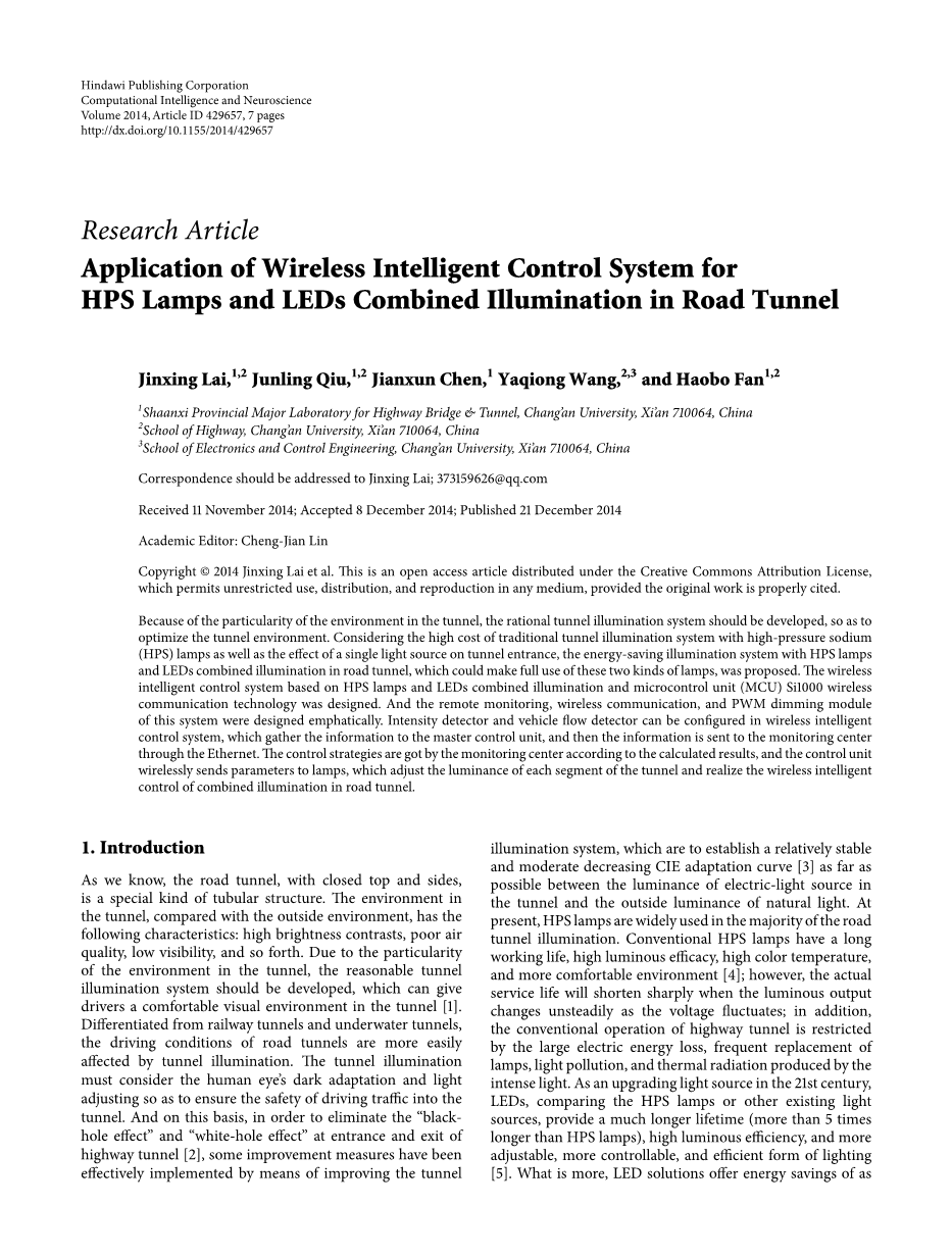 Title: Application of Wireless Intelligent Control System for HPS Lamps and LEDs Combined Illumination in Road Tunnel