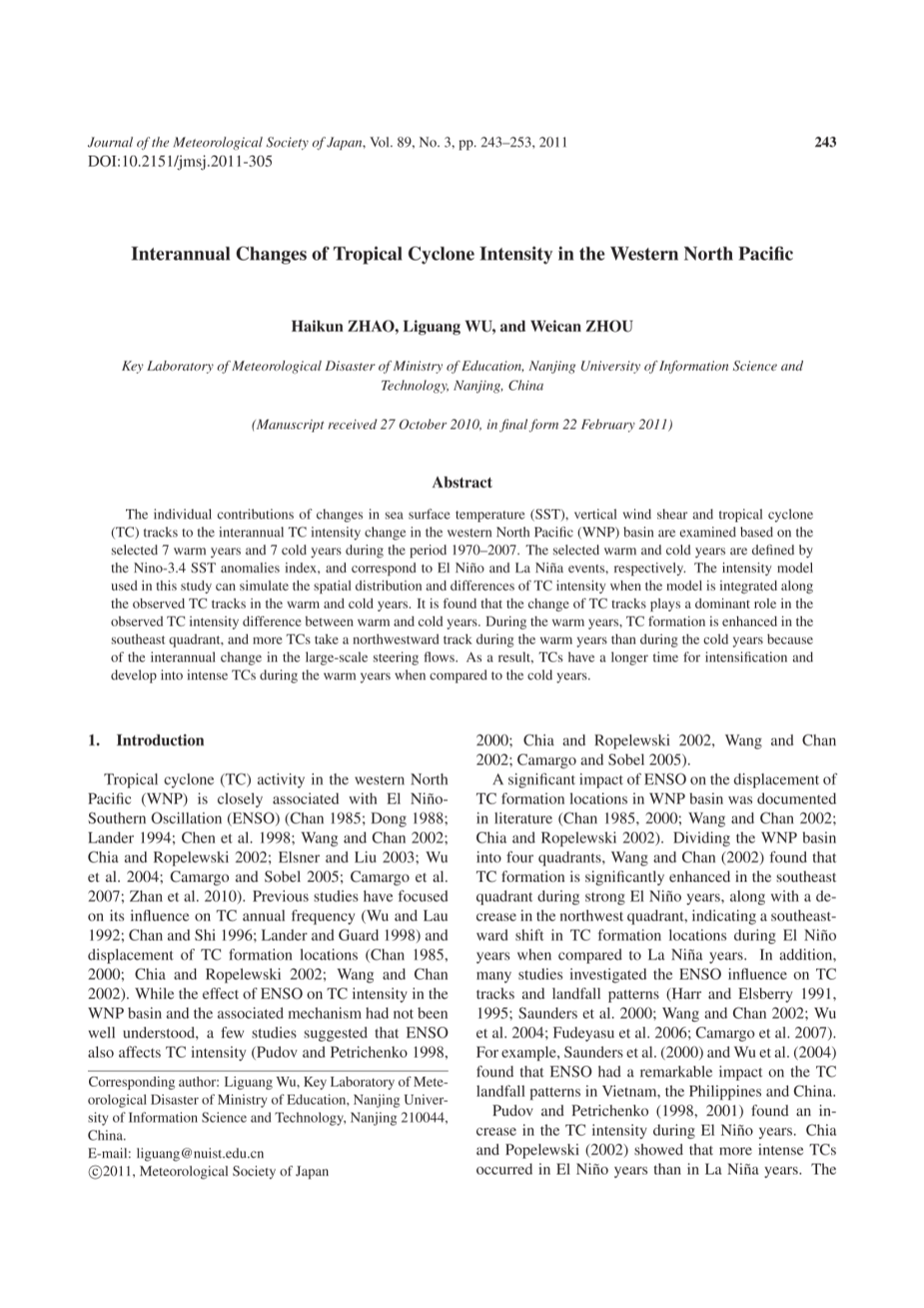 西北太平洋(WNP)热带气旋(TC)活动与El Nifio-南方涛动(ENSO)(Chan 1985; Dong 1988; Lander 1994; Chen等1998; wang和Chan 2002; Chia和Ropelewski 2002; Eisner和Liu 2003; wu等2004; Camargo和Sobel 2005; Camargo等 。2007; Zhan等2010)。 以前的研究集中在它对TC年度频率的影响(Wu and Lau 1992; Chan and Shi 1996; Lander and Guard 1998)以及TC形成地点的位移(Chan 1985,2000; Chia and Ropelewski 2002; Wang and Chan 2002)。 虽然ENSO对WNP盆地TC强度的影响及其相关机制尚不清楚,但一些研究表明ENSO也会影响TC强度(Pudov and Petrichenko 1998,2000; Chia和Ropelewski 2002,Wang和Chan 2002; Camargo和Sobel 2005)。