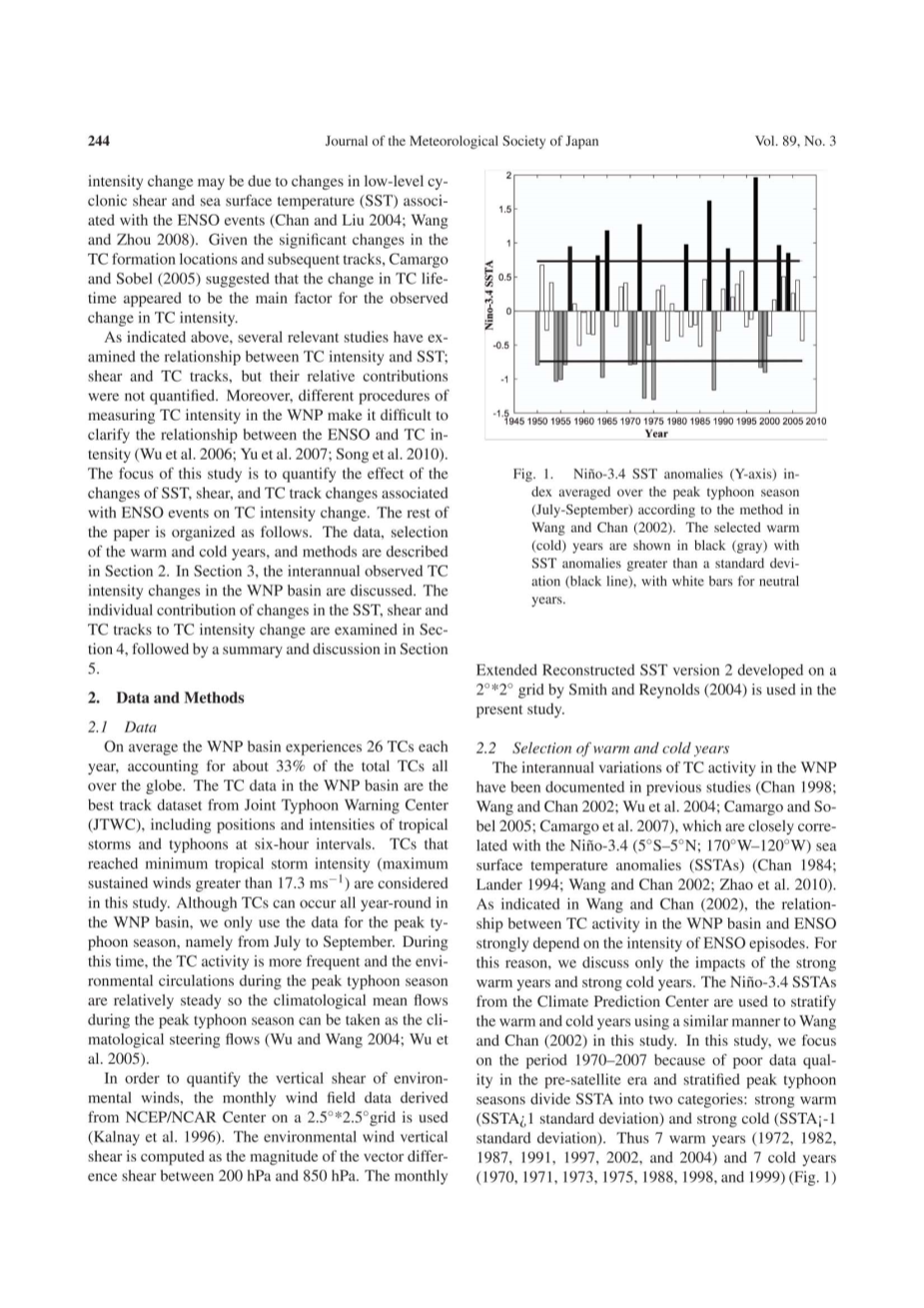 WNP中TC活动的年际变化记录在以前的研究中(Chan 1998; Wang and Chan 2002; wu et al.2004; Camargo and sobel 2005; Camargo et al.2007),这些研究与Nifi0- 3.4(5 0 S-5 0 N; 1700 W-1200 W)海表温度异常(SSTAs)(Chan 1984; Lander 1994; Wang and Chan 2002; Zhao et al。2010)。正如Wang和Chan(2002)所指出的,WNP流域的TC活动与ENSO之间的关系很大程度上取决于ENSO事件的强度。出于这个原因,我们只讨论强暖年和强冷年的影响。气候预测中心的Nifio-3.4 SSTAs用于本研究中使用与Wang和Chan(2002)类似的方法对温暖和寒冷的年份进行分层。在本研究中,我们将重点放在1970-2007年期间,因为卫星前时代的数据质量差,而高峰台风季节的分层将海温分为两类:强烈暖(SST和I标准偏差)和强冷(SSTAi-1标准偏差)。因此,7个温暖年份(1972年,1982年,1987年,1991年,1997年,2002年和2004年)和7个寒冷年份(1970,1971,1973,1975,1988,1998和1999)(图1)被选中。 选定的年份与通过使用更多传统定义所获得的ENSO事件相吻合(Trenberth 1997; Goddard and Dilley 2005)。 需要指出的是,由于学习时间不一致,所选择的温暖和寒冷的年份与王和陈(2002年)只有轻微的不同。 例如,Wang和Chan(2002)将1991年和1971年分别归类为温暖和寒冷的年份。