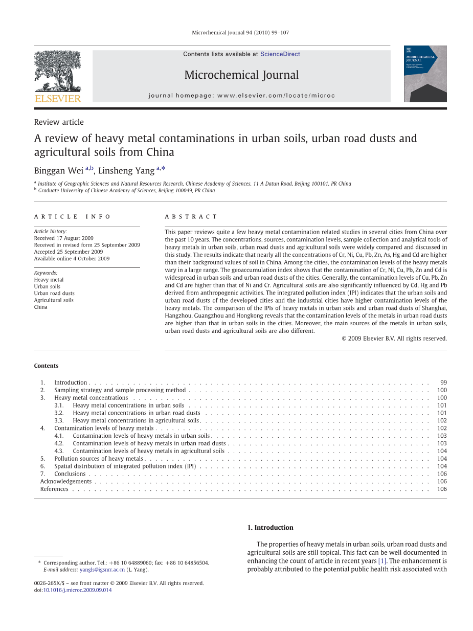 中国城市土壤,城市道路扬尘和农业土壤中重金属污染的综述
