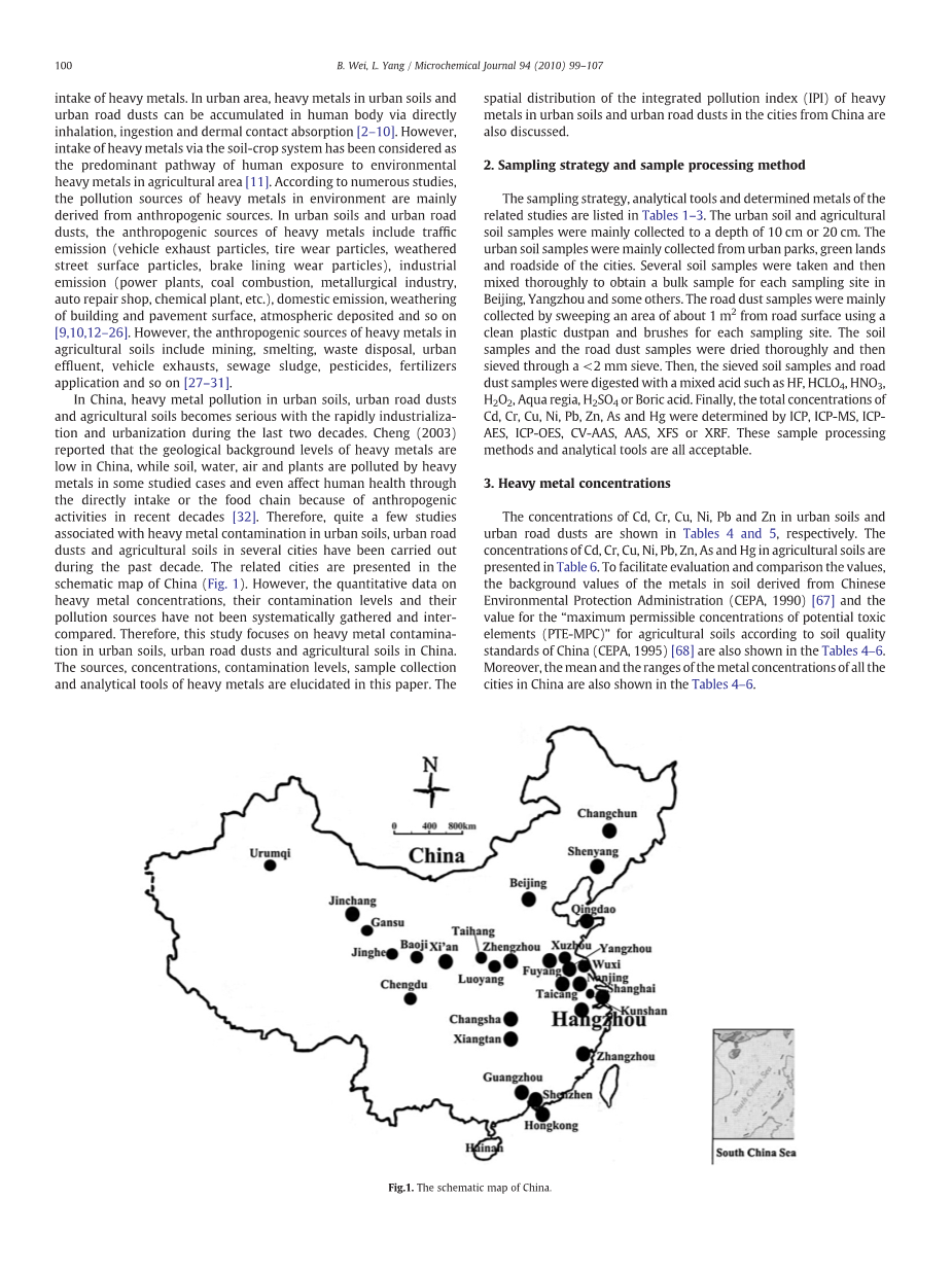 目前所了解的城市土壤,城市道路灰尘和农业土壤中重金属的性质仍然是局部的。这个事实可以从在近年来增加文章的数量来看出来。[1]这个增长可能与摄入重金属而造成潜在公共健康风险有关。在城市里,城市土壤和城市道路灰尘中的重金属可以直接通过呼吸,摄取和皮肤接触吸收而在人体内积聚[2-10]。然而,通过土壤--作物系统摄入重金属被认为是人类暴露在农业地区重金属环境的主要途径[11]。许多研究表明,重金属在环境中的污染源主要是人为来源。在城市土壤和城市道路灰尘,重金属的人为来源包括交通排放(车辆尾气颗粒,轮胎磨损颗粒,风化的路面颗粒,制动衬片磨损颗粒),工业排放(电厂,煤燃烧,冶金工业,汽车修理厂等),家庭排放,建筑和路面的风化,大气沉积等[9,10,12-26]。然而,农业土壤中重金属的人为来源包括采矿,冶炼,废物处理,城市排放,车辆排放,污水污泥,农药,化肥的使用等[27-31]。