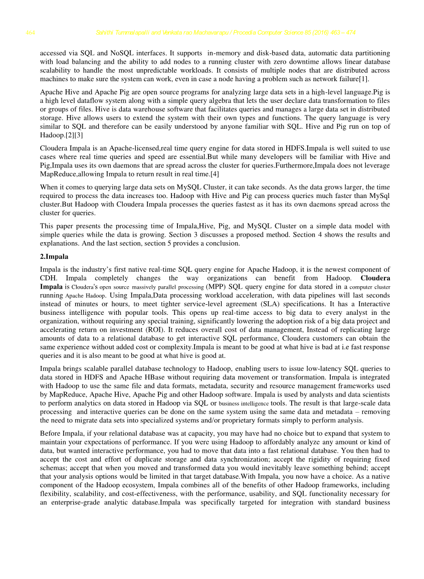 本文介绍了当数据增长时,对一个由简单的数据制成的简单查询,Impala,Hive,Pig和MySQL集群。第3节讨论了一个建议的方法。第4节显示结果和解释。最后一节,第5节提供了一个结论。