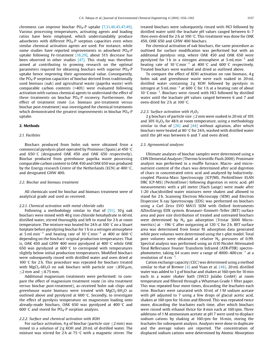 对于改善生物炭的除PO4-P能力而言[7,31,40,45,47,49],研究已经证明,基本的含氧官能团,例如金属氧化物,酮,吡喃酮和色烯可以提高生物炭对PO4-P的吸收。使用不同的处理温度,活化剂和负载量,即使使用类似的化学活化剂也可以产生不同PO4-P吸附能力的吸附剂。例如,虽然一些研究已经报道在通过Fe-方法得到的吸附剂PO4-P吸附能力得到提高[18,29],但是其他的研究表明吸附能力约减少了51%[47]。因此,本研究旨在促进获得高吸附能力生物炭的最佳参数方面的研究,来增加他们的农业价值。传统上使用的生物质(橡木)和农业废弃物(辣椒废物)在不同的化学试剂活化下生产出的生物炭的PO4-P的吸附能力将会被评估来理解这些方法对生物炭的PO4-P的回收的影响。此外,对处理方式(即生物质预处理与生物炭后处理)的影响进行了研究后,得到了生物炭PO4-P吸附的最佳处理方法。