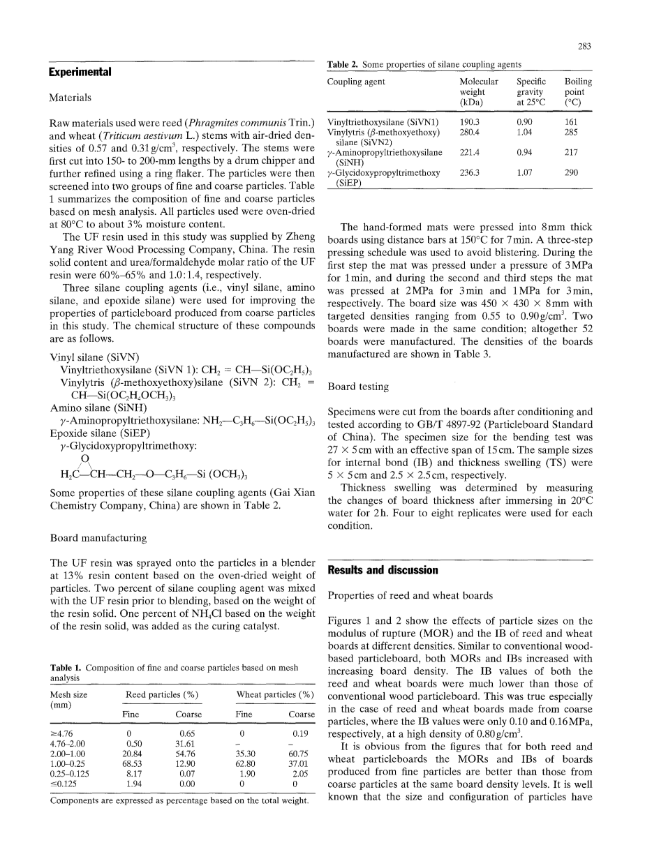 使用硅烷偶联剂对结合甲醛的芦苇和小麦刨花板的改善作用
