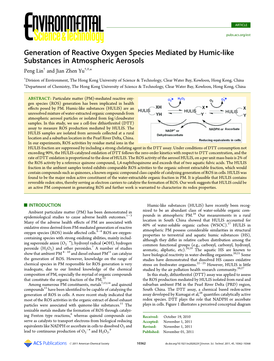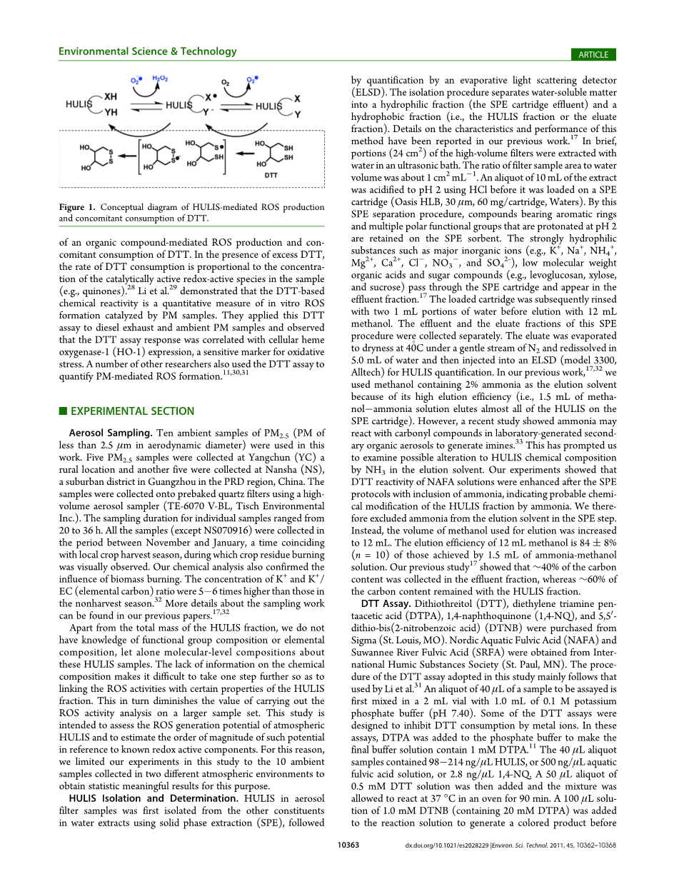 在本研究中,二硫苏糖醇(DTT)分析法被用于测定被HULIS介导的ROS产品。HULIS样品是分离自珠江三角洲农村和郊区所采集的气溶胶。DTT分析,一种由Kumagai等人研发的,基于氧化还原的化学分析法,定量催化氧化还原物质。DTT所扮演的角色就如同细胞里面的NADPH或者抗坏血酸。图片1说明了有机成分介导ROS产生和DTT伴随消耗的感官概念图。由于过量DTT的存在,DTT的消耗速率正比于样品中的氧化还原物质的催化活性(e.g.,醌)。李等人演示了通过PM样品,在试管中定量测定以DTT为基础的化学反应活性对ROS的催化形成。他们应用这种DTT去分析柴油机尾气和环境中的PM样品,并且观察了DTT分析结果是与细胞血红素(HO-1)的表现有关联,一种氧化压力的敏感符号。其他许多的研究人员也同样运用DTT分析法去确定PM介导ROS的形成。