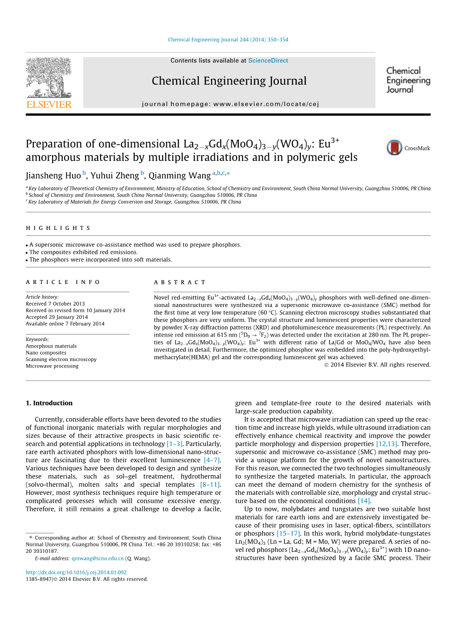 到目前为止,钼酸盐和钨酸盐是两个适合稀土离子掺杂的基质材料,而且由于在激光、光纤、闪烁体以及荧光体方面的应用前景,研究者对它们进行了广泛的研究。在本篇文章中,我们制备了混合钼钨酸盐Ln2(MO4)3 (Ln = La, Gd; M = Mo, W)。我们也已通过一个简单的SMC过程合成一系列具有一维纳米结构的新型红色荧光粉(La2-xGdx(MoO4)3-y(WO4)y: Eu3 )。我们还对它们的晶体结构和光致发光(光致发光)的性质进行了详细的探讨,并提出了一种关于这种一维纳米材料形成机理的可能假设。此外,我们将这些普通发光纳米棒作为荧光探针引入透明HEMA(甲基丙烯酸乙酯)凝胶网络中,并因此成功地获得了一种新类型的对温度变化有识别能力的软质响应材料。
