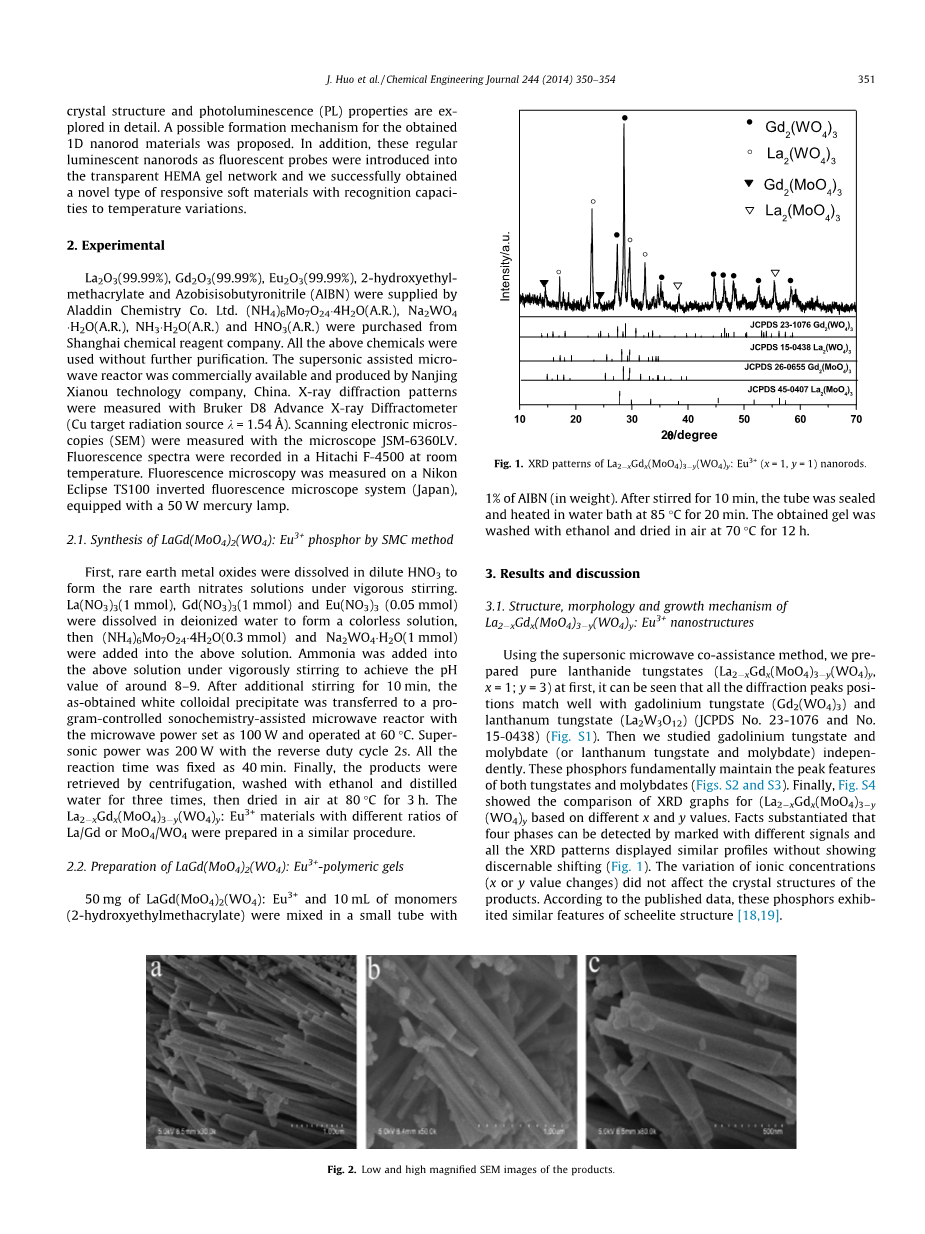 首先,将稀土金属氧化物溶解在稀硝酸中,在剧烈搅拌下形成稀土硝酸盐溶液。接着,将La(NO3)3(1 mmol), Gd(NO3)3(1 mmol) and Eu(NO3)3 (0.05 mmol)溶解在去离子水中形成无色溶液,然后将(NH4)6Mo7O24·4H2O(0.3 mmol)和 Na2WO4·H2O(1 mmol)加入到上述溶液中。在剧烈搅拌下将氨水加入上述溶液中,使得PH值达到8~9。搅拌10 min后,将所得到的白色胶状沉淀转移到程控超声微波化学反应器中,微波功率设置为100W,在60℃下操作。超声波的功率为200W,其反周期为2s。所有的反应时间都固定为40分钟。最后,产品通过离心法提取,用乙醇和蒸馏水洗涤三次,然后在80℃气氛中干燥3小时。可用类似的方法可制备不同La/Gd或MoO4/WO4比例的La2-xGdx(MoO4)3-y(WO4)y: Eu3 材料。