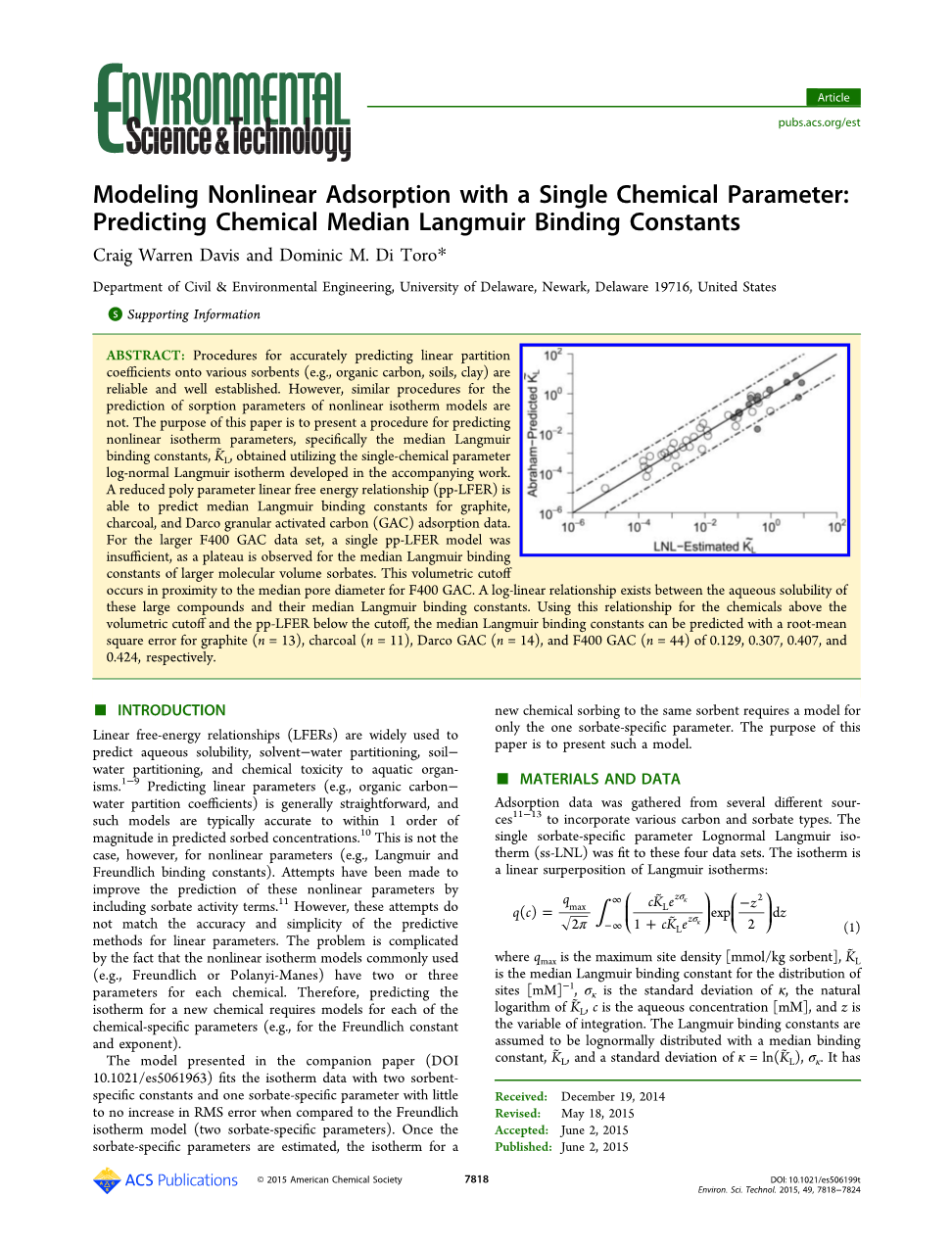 单一化学参数的非线性吸附模型:用化学方法预测中值朗缪尔 结合常数