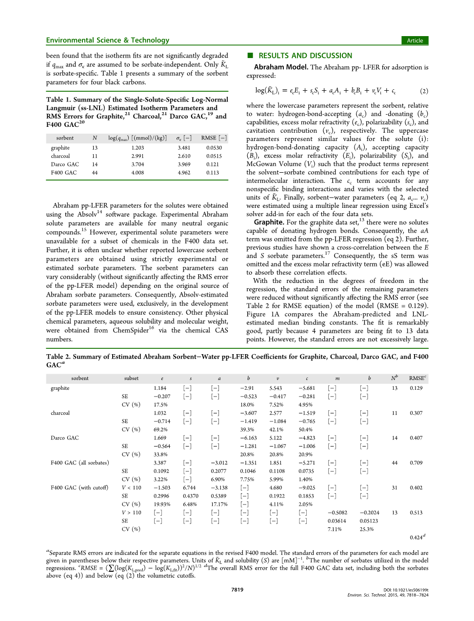 木炭。对于木炭的数据集13,减少对于石墨—亚伯拉罕模型的观察。对于石墨来说这个模型使木炭—水LNL吸附常数是相同的。回归的结果是一个有效误差为0.307,4个参数适合11个化学物质。图1B比较了预测和模型的中值结合常数。散射更多,而且参数的标准误差相当大,参数估计中的一半表明有足够数量的化学物质能产生一个适合木炭的好的模型。作为石墨数据集,木炭数据集具有相同的附着物(菲和氯苯除外)。而一些估计参数标准误差的增加是因为自由度的减小(11对13的化学物质),附着物参数值也起到重要作用。在这些木炭数据集的参数中菲和氯苯的E和V分别在高端和低端的范围内有用。除去这些极端的吸附参数后可显著提高相应的吸附亚伯拉罕参数的标准误差。因此,标准误差反映数据的数量和附着物参数的范围。