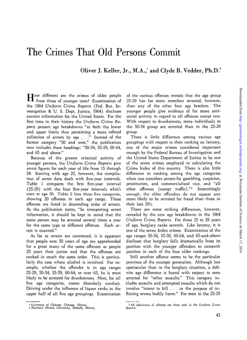 萨瑟兰(1934)写道:刑事案件中相当大一部分关注了老年人的犯罪行为,他认为:侵犯财产罪中年龄最大的大约是20岁。1938年致力于监狱和管教所的调查显示犯盗窃罪、抢劫罪、杀人罪和伪造罪的男性平均年龄为24岁,因欺诈和挪用公款而被逮捕的平均年龄分别为30岁和37岁。醉酒、行为不检,以及流浪的犯罪嫌疑人的年龄很高,很大程度上是在中年人和老年人。虽然年老的犯罪率低与儿童时期相比,它有一些特有的特征,其中最重要的是性犯罪。鲍尔斯在印第安纳州发现三分之二的犯罪记录中,就有175例强奸案是超过50岁的男人犯的男人70岁以上提交重大盗窃案的比率是在1到150,这比男性年龄在18岁到21岁犯罪的4倍。