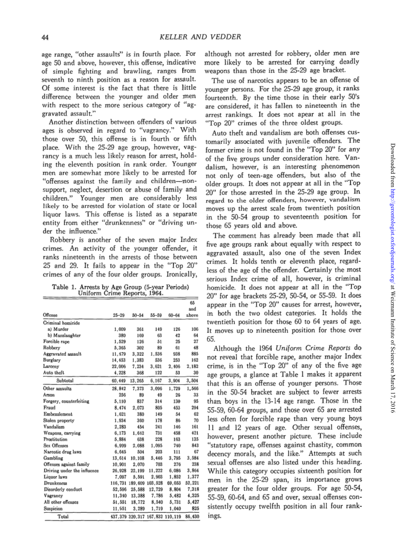 老年人的犯罪与年轻人犯罪有什么不同呢?《1964统一犯罪报告》披露美国当前的信息,这是历史上第一次将犯罪情况报告出来。“在上下极限之间允许更精确的逮捕的年龄hellip;hellip;”。现在刊物包括这些标题: “50-54岁,55-59岁,60-64岁和65岁以上的。” 而不是前一类的“50岁及以上”。