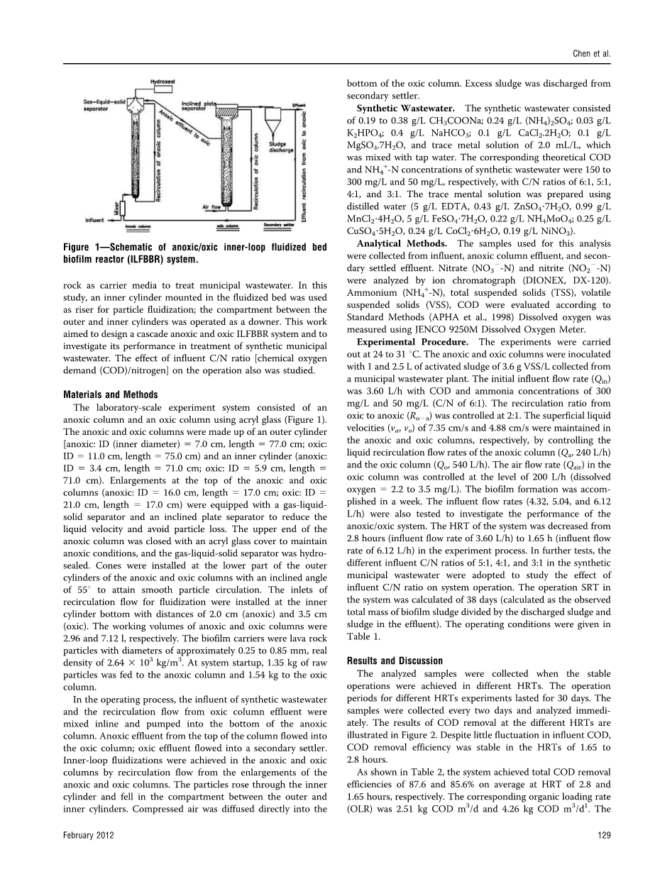 一些研究已经尝试内循环流化床生物膜反应器(ILFBBR)(使用沙子和岩浆岩作为载体媒介)来处理废水。在这项研究中,在流化床上一个内部的圆柱体配置用作升管提升颗粒的流化,在外部和内部的圆柱体的对应部分是一个降管。这项工作目的在于设计一个喷流式厌氧/好氧的ILFBBR系统和探寻它对城市污水处理效率。流动的C/N比(COD/氮化物)对于操作的影响也同时被研究。