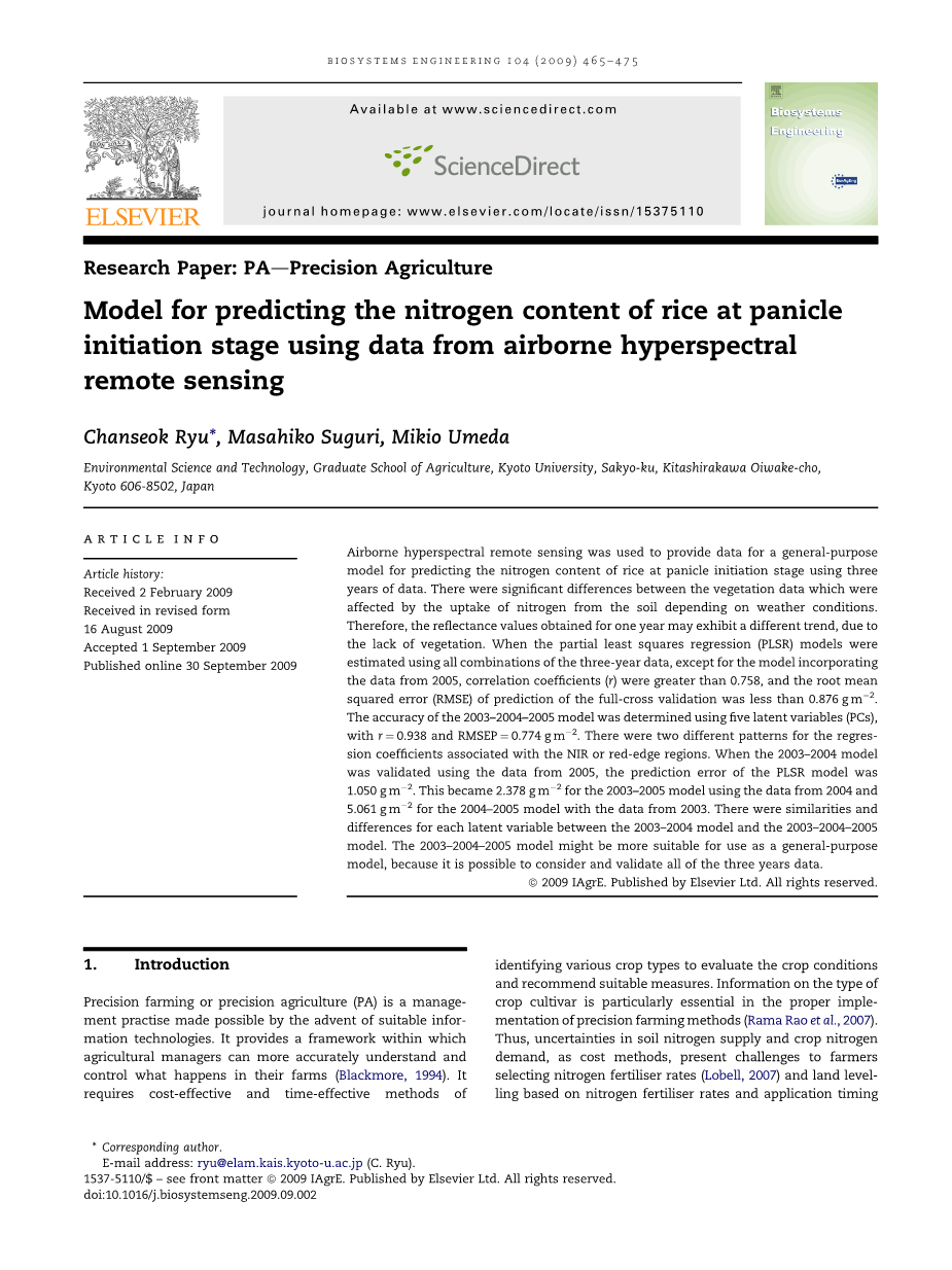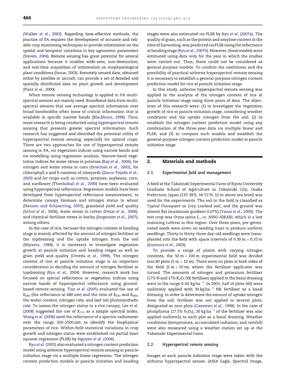 Ryu用航空高光谱遥感通过多元线性回归评估了穗分化期的氮含量预测模型。穗分化期和抽穗期的氮含量预测模型也通过偏最小二乘回归估计。谷物的质量,如成熟期的蛋白质和直链淀粉含量,用抽穗期的反射率通过偏最小二乘回归估计。但这些模型是用早期数据估计的,因此不会被考虑作为通用模型。为了确认航空高光谱遥感的可用性和实用性,有必要建立一个水稻在穗分化期的氮含量通用预测模型。