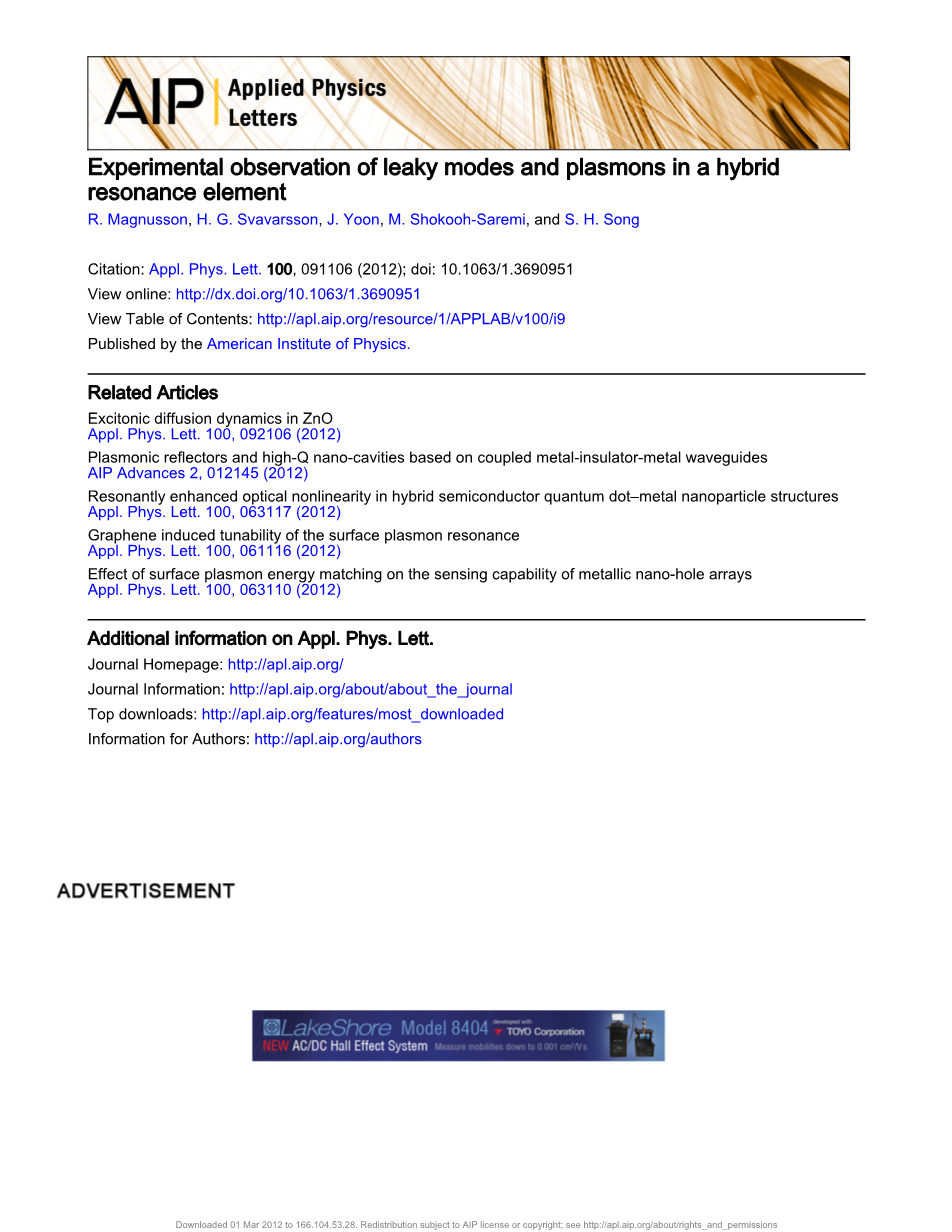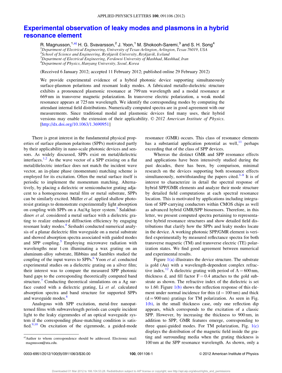 我们提供支持同时表面等离子体激元和谐振漏模式混合光子器件的实验的证据。装配式的金属-电介质结构具有明显的 plasmonicresonance 799 毫微米波长和 669 模态共振在横向磁极 nm。在横向极化,弱的模态共振出现在 725 nm 波长。我们通过计算助理内部场分布确定相应的模式。数值计算的谱是在我们的测量很好的吻合。由于传统的模态分析及电浆设备找到的多种用途,其混合动力版本可能启用扩展其适用性