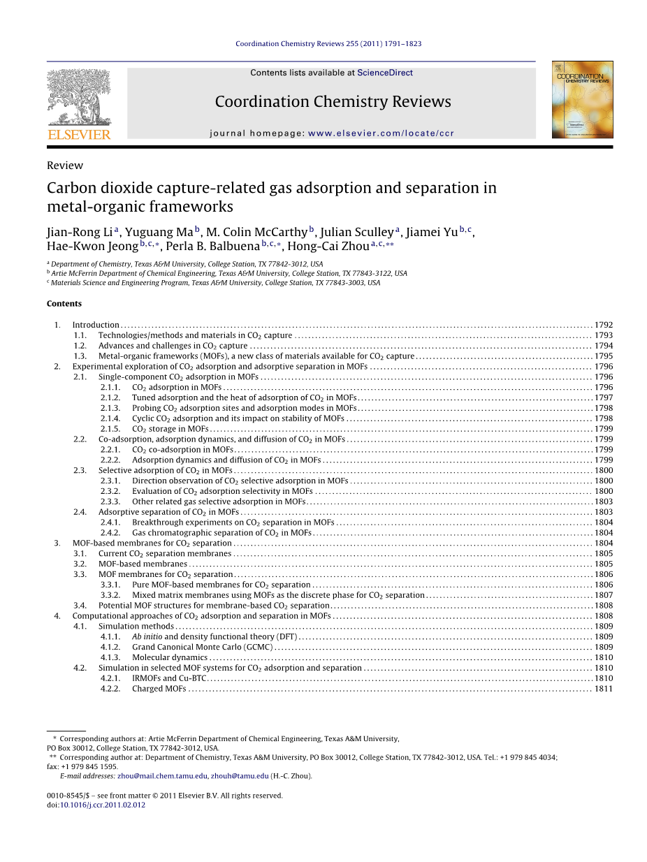 二氧化碳捕集相关金属有机骨架中气体的吸附和分离