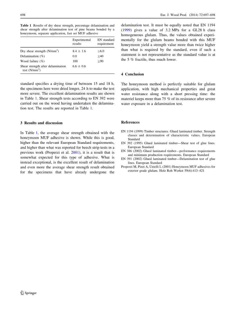 An industrial melamine-urea–formaldehyde (MUF 4535 from Dynea, Brebie `res, France) resin was used to bond dry wood at 9 % equilibrium moisture content (emc). A particularly fast setting rate melamine-urea–formaldehyde (MUF) experimental honeymoon adhesive of performances already reported in Properzi et al. (2001) was used; its two components were composed as follows. Component A: MUF resin at a pH of approximately 10, solids content of 63–65 %, and viscosity of 3,000–3,500 mPa.s with no fillers added. Component B: 38 % water solution of formic acid. Seven pine (Pinus sylvestris) wood pieces of dimensions 200times;110times;15 mmsup3; according to European Standard EN 386 (2002) for each beam were spread on one face with component A and on the other face with component B. The beam so formed was then clamped at a pressure of 0.6 N/mm2 and left in the clamp at 20 ℃ for 3h only. The samples were then cut according to the European Standards EN 391(2002) and EN 392 (1995), conditioned for 1 week at 20 ℃ and 65 % relative humidity and then tested for shear strength and percentage wood failure. The results obtained are shown in Table 1 and are the average of 12 tests. The remaining specimens were then subjected to delamination tests according to EN 391, method B: impregnation with water at 10–20 ℃ in an autoclave for 30 min at 70–85 kPa followed by 120 min at 500–600 kPa. After this the specimens were placed in an oven at 75 ℃, 8 % humidity and 2 m/s air circulation. The percentage of delamination was measured after the specimen had returned to 100–110 % of its initial weight. While the Table 1 Results of dry shear strength, percentage delamination and shear strength after delamination test of pine beams bonded by a honeymoon, separate application, fast set MUF adhesive standard specifies a drying time of between 15 and 18 h, the specimens here were dried longer, 24 h to make the test more severe. The excellent delamination results are shown in Table 1. Shear strength tests according to EN 392 were carried out on the wood having undertaken the delamination test. The results are reported in Table 1.