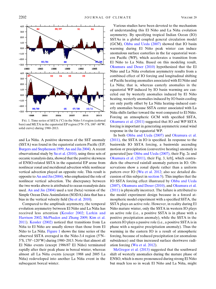 一个重要的与ENSO有关动力学问题是什么导致了厄尔尼诺和拉尼娜之间振幅不对称,正偏态的海温异常(SSTA)发生于赤道东太平洋地区(EP; BurgersandStephenson1999;AnandJin 2004).最新的一项由Su et al. (2010)做的观察性研究,采用三份海洋再分析数据,表明正偏度的ENSO海温异常在赤道EP是由于非线性的纬向和经向平流产生而非线性垂直对流起反作用。这个结果相反于An and Jin(2004),他强调线性垂直平流的作用,上述两个作品之间的差异是由于海洋再分析数据的使用,An and Jin (2004)用了一个简单的海洋数据同化的测试版本,数据在垂直速度区域上有误差。(Su et al. 2010).