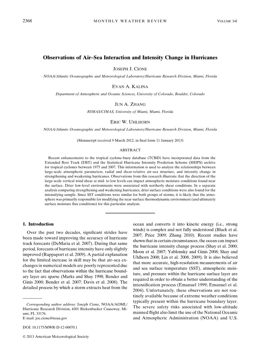 在过去的20年,飓风路径预报的准确性的改善已经取得了显著的进步(DeMaria等2007)。在同一时期,飓风强度的预报仅仅略有改善(Rappaport等 2009)。对技术上有限的增长的部分解释可能是由于在飓风边界层观测稀疏,数值模式中海-气交换很难体(Marks和Shay 1998;Bender和Ginis 2000;Bender等 2007;Davis等 2008)。风暴从海洋中获取热量并将其转换成动能(即:强风)的详细过程是复杂的并且还没有被完全理解(Black等2007;Price 2009;Zhang 2010)。最近的研究表明,在某些情况下,海洋会影响飓风强度的变化过程(Shay等 2000;Moon等 2007;Yablonsky和Ginis 2008;Shay和Uhlhorn 2008;Lin等 2008,2009)。为了获得对这个强化过程的更好的理解,需要更精确的、高分辨率的在飓风边界层内的大气量度和海表面温度(SST)、大气湿度和气压(Emanuel 1999;Emanuel等 2004)。不幸的是,由于飓风边界层内通常存在极端的天气状况,因此这些观测不能常规获得。与低空载人飞行相联系的严重的安全风险也限制了在强风的飓风边界层环境下美国国家海洋和大气管理局(NOAA)和美国空军侦察机的使用来进行连续、直接的测量任务。虽然最近在热带气旋中无人机系统使用的进步可能有一天会提供一种可行的方式来弥补这关键的数据缺失,但是直到现在,只有少数的无人任务成功地实行了(Cione等 2008;Lin和Lin 2008)。由于这些限制,利用几十年在热带气旋中浮标观测的努力,使得在这罕见的观测环境下通常出现的混合的大气-海洋分析的描述条件得到发展(Cione等 2000,2009; Cione和Uhlhorn 2003)。建立在这些早期的研究结果上,本次研究将记录(和对比)与增强和减弱飓风相联系的近表面的热力学条件和调查和飓风中大气-海洋结构的观测模式潜在相关的物理过程。