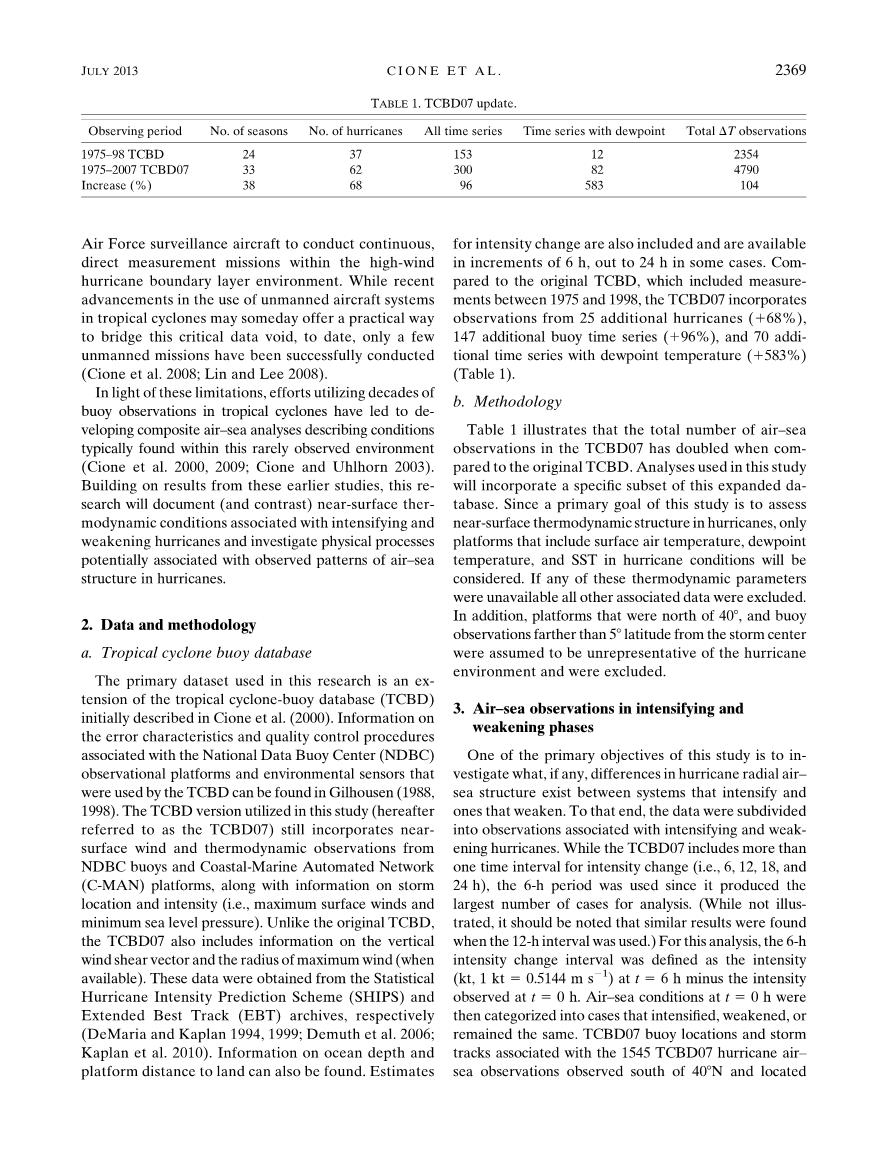 本研究中用到的主要数据是Cione等人(2000)最初描述的热带气旋浮标数据库(TCBD)的扩展。被TCBD使用的和国家数据浮标中心(NDBC)观测平台和环境传感器相关的误差特性和质量控制程序的信息可以在Gilhousen的文章(1988,1998)中发现。本次研究中利用的TCBD的版本(以下简称TCBD07)仍然包含近表面风和来自NDBC浮标和沿海海洋自动化网络(C-MAN)平台的热力学观测值,以及风暴位置和强度的信息(即:最大表面风速和最低海平面气压)。不像原来的TCBD,TCBD07还包括垂直风切变矢量和最大风速半径的信息(可用时)。获得的这些数据分别来自统计的飓风强度预测方案(SHIPS)和扩展的最佳路径(EBT)档案(DeMaria和Kaplan 1994,1999;Demuth等 2006;Kaplan等 2010)。海洋深度和平台到陆地距离的信息也能被发现。强度变化的估计也包含在内,并且在某些情况下,6小时到24小时的增量也可获得。相比于原来的包含从1975年到1998年的测量值的TCBD,TCBD07吸收了25个额外的飓风( 68%)、147个额外的浮标时间序列( 96%)和70个额外的有露点温度的时间序列( 583%)(表1)。