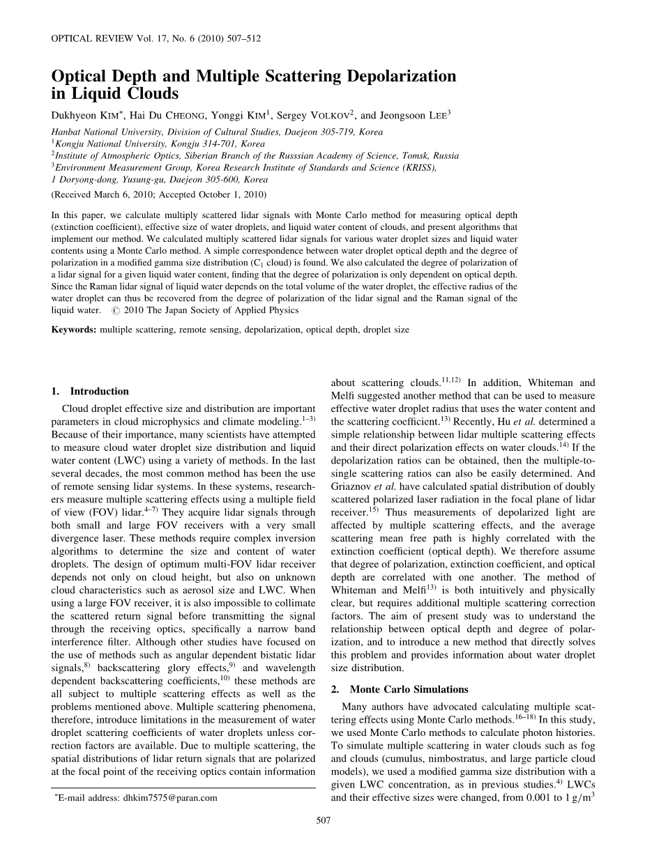 云滴有效大小和分布是云微物理和气候模型的重要参数。由于其重要性,许多科学家都试图运用各种各样的方法测量云水液滴尺寸分布(CES)和液态水含量(LWC)。在过去的几十年中,最常用的方法是使用遥感激光雷达系统。在这些系统中,研究者利用多领域视角(FOV)激光雷达测量多重散射效应。他们采用小型激光雷达和或者拥有小灵域视场的大型激光雷达系统来获得雷达信号,这些方法需要复杂的反演算法来确定水滴的尺度大小和水含量。最佳多视场激光雷达接收机的设计不仅取决于云的高度,也取决于未知的云特性如气溶胶粒子大小和含水量。此外,在使用大视场接收器的情况下,在通过接收光学传输信号之前运用一个窄带干涉滤光片来说校准散射回波信号是不可能的。虽然其他研究都集中在使用的方法,如角运用相关双基地激光雷达信号,求解与波长相关的后向散射系数hellip;这些方法都受到多重散射效应以及上面提到的问题的影响。因此,除非引入一些校正因子,多重散射效应将对水滴相关参量的测量结果将引起很大误差。由于多重散射效应,激光雷达回波信号的空间分布在接收光学系统的焦点包含了散射云的信息。此外,怀特曼和梅尔菲建议另一种方法,可以用水量和散射系数来测量水的有效液滴半径。最近,胡等人确定一个简单的激光雷达多重散射效应及其对水云的直接极化效应的关系,如果可以得到去极化率,然后多个单次散射比也可以很容易地确定。Griaznov等人在激光雷达接收机焦平面上计算了双散射偏振激光辐射的空间分布。因此,光的去极化受到多重散射效应的影响,光子的平均自由路径与消光系数高度地相关,我们假设偏振度、消光系数、和光学厚度是彼此相关。怀特曼和梅尔菲的方法既直观、清晰的物理意义,但需要额外的多重散射校正因子。本研究的目的是了解光学厚度和偏振度之间的关系,并引入一个新的方法,求出了这种一一对应的关系,并提供水滴大小分布的信息。