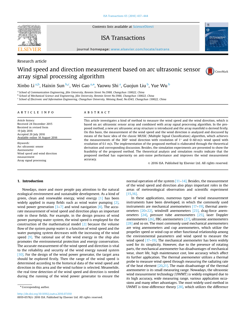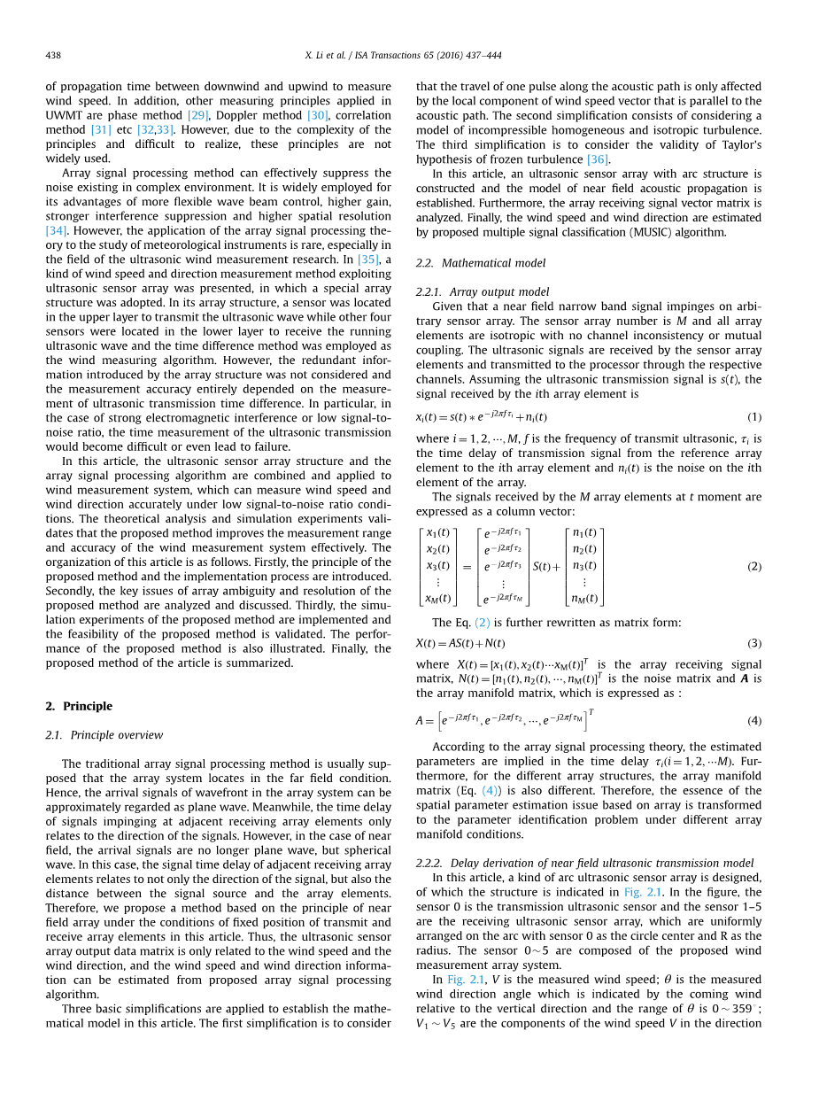 阵列信号处理方法可以有效抑制噪声存在于复杂环境中。广泛应用于其优点是波束控制更灵活,增益更高,更强的干扰抑制和更高的空间分辨率。然而,阵列信号处理理论对气象仪器研究的应用很少见,特别是在超声波风测量研究领域。在中,a风速和方向测量方法的开发提出了超声波传感器阵列,其中特殊阵列结构采用。在其阵列结构中,定位了传感器在上层传输超声波而其他四个传感器位于下层,以接收运行超声波和时差法用作风测量算法。但是,不考虑由阵列结构引入的冗余信息测量精度完全取决于超声波传输时间差的测量。特别是在电磁干扰强或信号比较低的情况下,超声波传输的时间测量会变得困难甚至导致失败。在本文中,超声波传感器阵列结构与阵列信号处理算法结合使用风测量系统,可以测量风速风向在低信噪比条件下准确。理论分析和仿真实验验证了所提出的方法提高了测量范围有效的测风系统的精度。