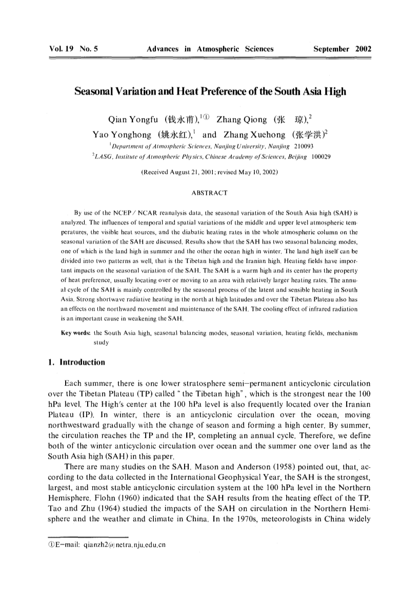 翻译原文:Qian Y, Zhang Q, Yao Y, et al. Seasonal Variation and Heat Preference of the South Asia High[J]. Advances in Atmospheric Sciences, 2002, 19(5): 821-836.