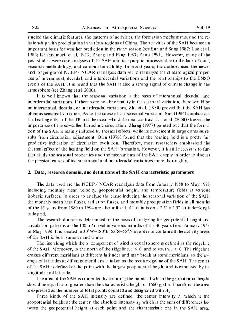 每年夏天,在青藏高原之上平流层下部有一个半永久性反气旋环流在青藏高原(TP)称为“青藏高压”,最强可达到100hPa。在100 hPa的高压中心也经常在伊朗高原附近(IP)。在冬天,在海洋上有一个反气旋式环流运动,逐渐随着季节的变化向西北方向移动,并形成一个高压中心。到了夏天,循环可到达青藏高原和伊朗高原区域以此完成一年的周期。因此我们在这篇论文中将冬季海洋上的反气旋环流定义以及夏季在陆地之上的反气旋定义为南亚高压(SAH)。
