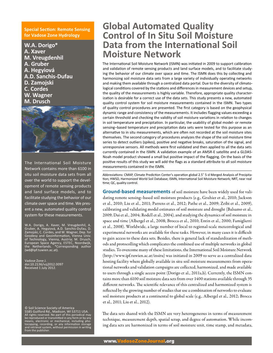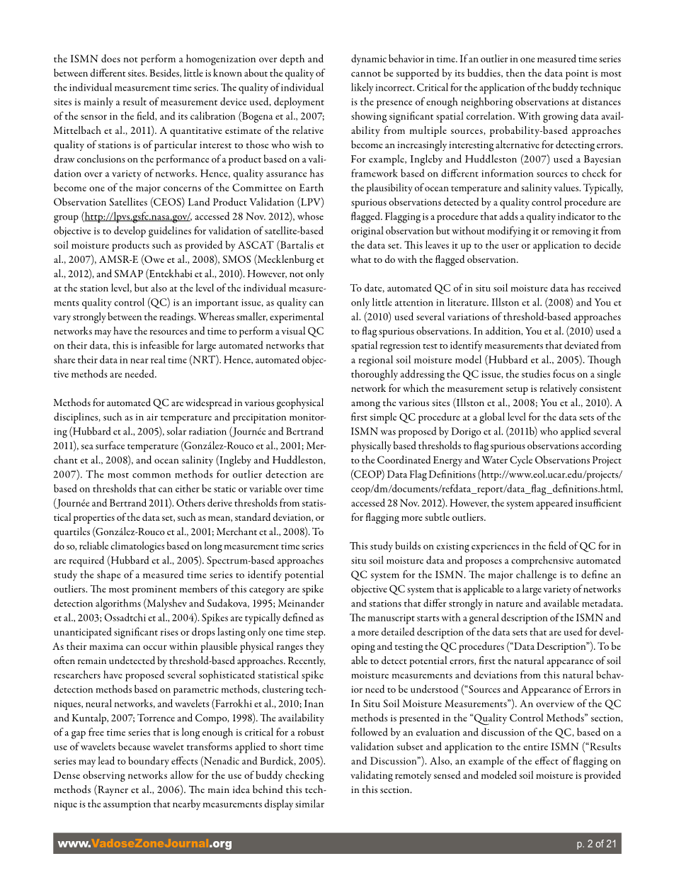 到目前为止,自动控制的现场土壤湿度数据只在文献方面收到很少的关注。Illston 等(2008) and You 等 (2010) 使用了几种基于阈值的方法来标记虚假观测。此外,You 等 (2010)使用空间回归测试来确定测量偏离区域土壤湿度模型(Hubbard 等, 2005)。虽然彻底解决质量问题,研究集中在单一网络的测量设置相对一致的网站(Illston等, 2008; You等, 2010)。 第一个简单的质量控制程序在对ISMN的数据集全球级别的程序是由Dorigo等人(2011 b)提出的。应用几个物理基础阈值伪观测根据协调能源和水周期观测项目(CEOP)数据标记定(http://www.eol.ucar.edu/projects/ceop/dm/documents/refdata_report/