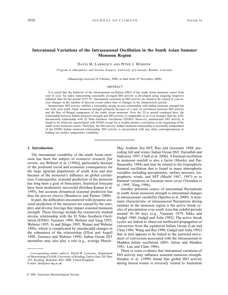 DAVID M. LAWRENCE和PETER J. WEBSTER,科罗拉多大学大气与海洋科学系