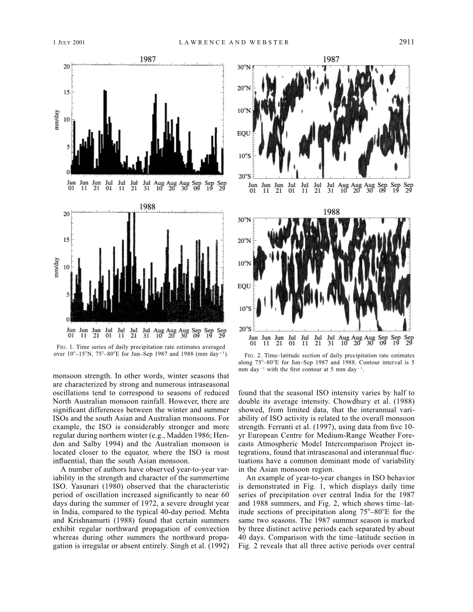 ISO活动中年复年改变的一个例子是,如图1所示,展示了从1987到1988年夏季印度中部逐日降水序列,图2是时间纬度的降水图,区域为75ordm;—80ordm;E。在1987年夏季有三个典型活跃的阶段,分别为四十天左右。对比图2的时间纬度图展示了印度中部的三个活跃阶段与降水系统向北传送有关。相反,在1988年夏季,并没有明显活动和中断期,而整个季节的降水也是相对于稳定。特别是,1988年夏季绝大部分时间的降水量比较小。此外,降水向北连续运动的证据有着很大部分的缺失,除了7月1日到21日这一一大的降水事件Vernekar et al.(1993)之前提出ISO强度有着显著的差异,在1987年ISO强度很强,而在1988年ISO活动实际上就消失了。
