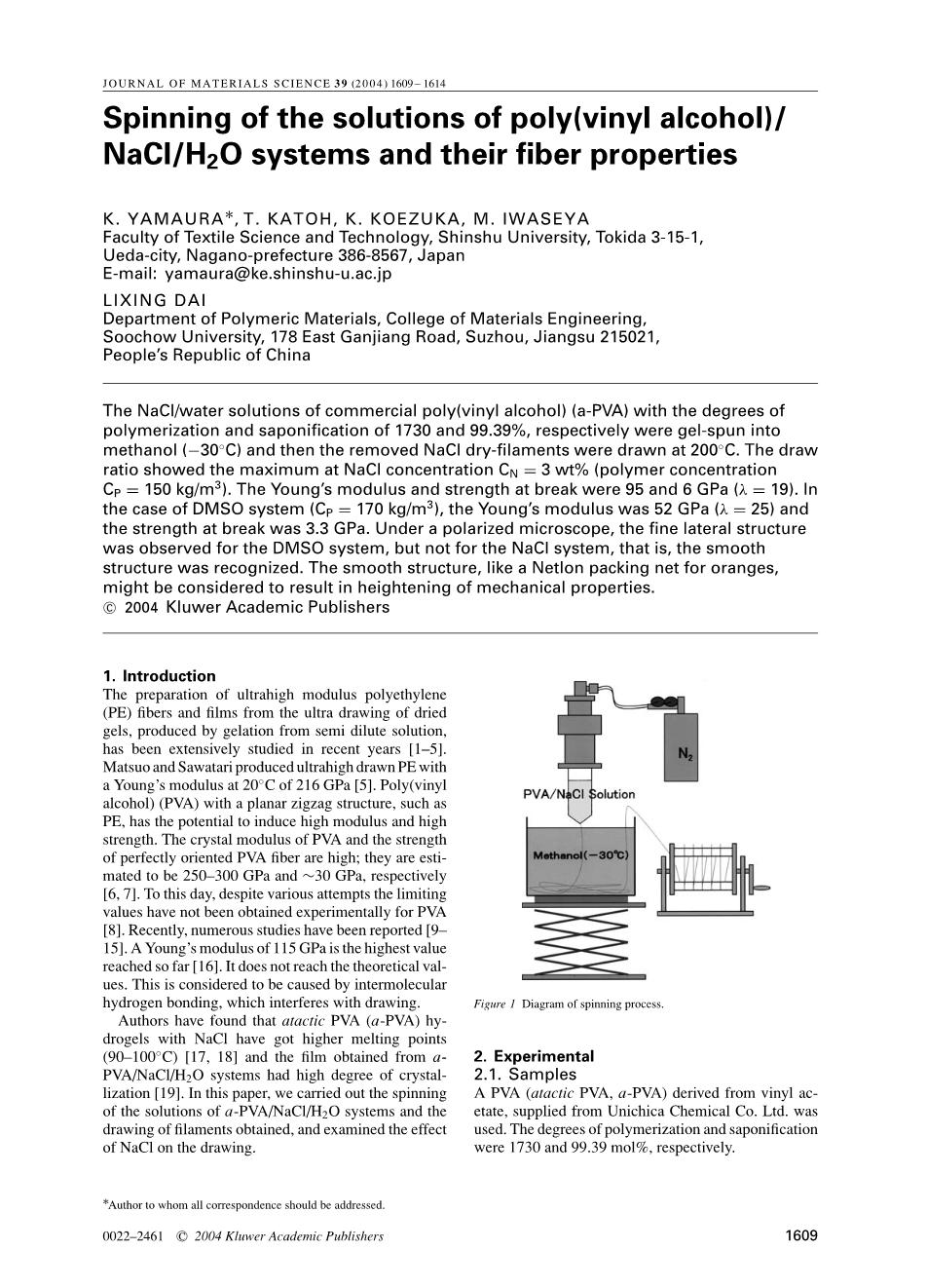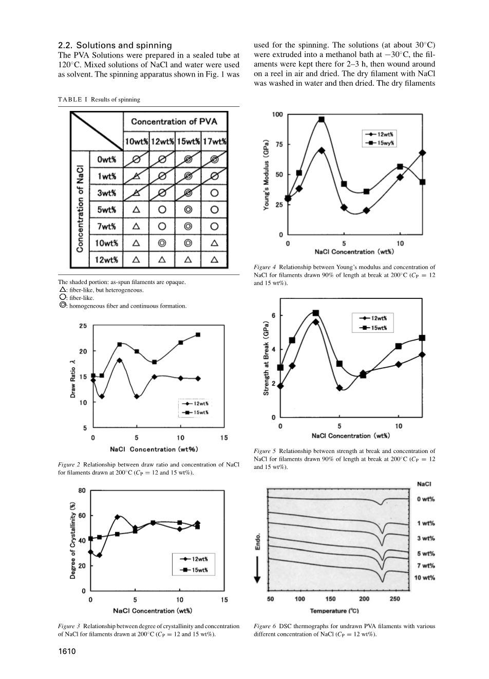 作者已经发现,不规则的PVA(a-PVA)与NaCl混合物具有较高的熔点(90-100℃)[17,18],从PVA / NaCl / H2O体系获得的膜具有高度的晶体化[19]。在本文中,我们进行了a-PVA / NaCl / H2O体系的溶液纺丝和所得长丝的拉伸,并研究了NaCl对拉伸的影响。