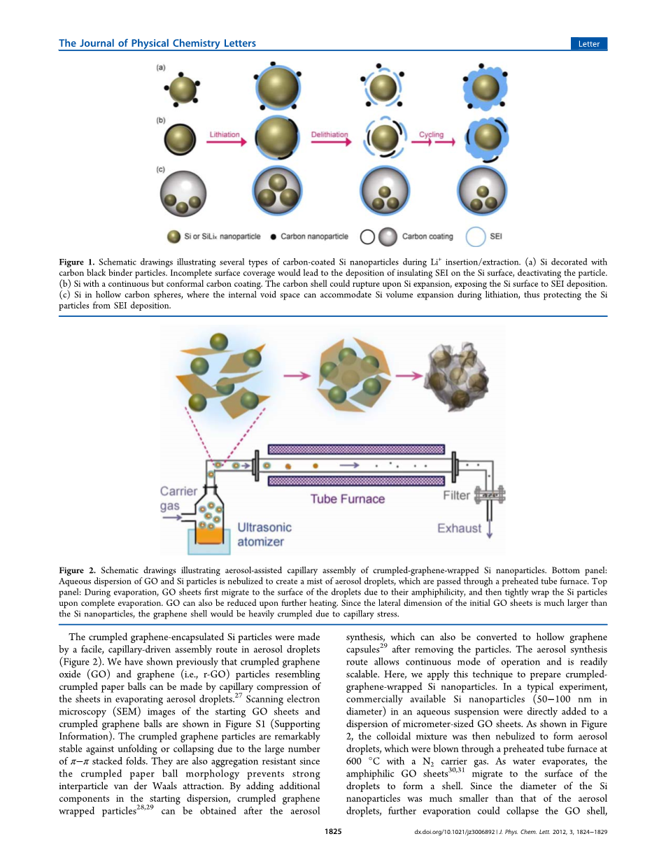 理论和最近原位透射电子显微镜(TEM)的研究已经表明,应变诱导的膨胀/收缩可以容纳在硅纳米颗粒的直径为150纳米以内(7,8)。是实上,已经表明,各种硅纳米结构(9)包括纳米线(10,11),纳米管(12,13),空心球体(14,15),纳米颗粒(16,17)和纳米多孔硅(18,19)能够承受的Li 输入/输出而不显著开裂或断裂。然而,这些裸露的硅纳米结构上的固体电解质界面层的形成(图1a)限制了他们的库伦效率即使在达到稳定状态后也小于99%,这就会使得阴极和电解质在仅仅几十个周期之内耗尽。相比较而言,石墨阳极的库仑效率可以很容易的在前几个周期后达到99.9%(20)。一种防止固体电解质层在硅表面沉积的方式是通过施加表面涂层来避免其与电解质溶液的直接接触,这需要电导和锂离子的渗透。碳基材料(21-25)已经是一种有吸引力的选择。然而,在体积膨胀后,共形碳涂层会破裂,使得固体电解质沉积会发生在与电解液接触的硅上(图1b)。因此,需要一种可以容许硅的大体积膨胀/收缩的新型碳涂层。这可以通过Si和碳涂层之间引入空隙空间来实现。例如,最近刘等人报道了一种周期为500~1000的具有高库伦效率的碳包覆硅(图1c)“蛋黄壳”设计(26)。他们的方法是先局部氧化硅纳米粒子形成二氧化硅表面层,然后形成聚合物壳薄涂层,用来之后对无定形碳的热解。通过氢氟酸的腐蚀除去二氧化硅以及减小硅的纳米颗粒和在碳空心球内部产生的空隙空间的尺寸,以此可以容许硅在锂化过程中的体积膨胀,从而防止碳壳破裂,大大改善了循环稳定性。这儿我们讲述一种通过使用厚厚的褶皱石墨烯(又名还原石墨烯,r-GO)壳包裹硅的纳米粒子的方法。这种简单一步到位的方法,利用褶皱石墨烯的褶皱和具有柔韧性的特点,使得纳米硅粒子在膨胀过程中不会破坏石墨烯壳,从而有效地保护硅颗粒。