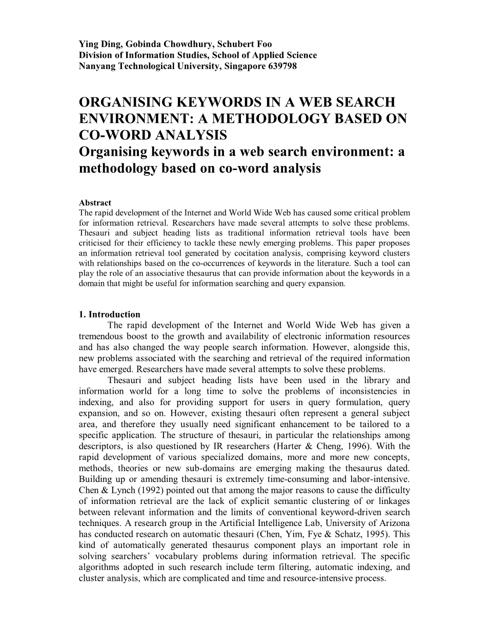 在 WEB 搜索环境中的组织关键字: 共词分析 METHODOLOGYBASED