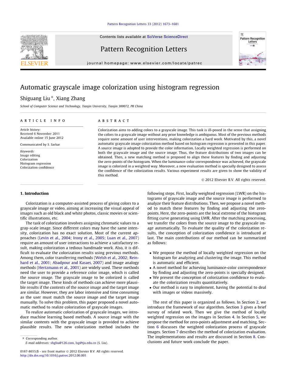 实现灰度图像的自动彩色化,我们引入了一种基于机器学习的方法。提供了和灰度图像具有相似内容的源图像以达到合理的结果。新图的的彩色化方法包括以下步骤。首先,对灰度图像的直方图和源图像进行局部加权回归(LWR)来分析其特征分布。然后,我们提出了一种新的方法通过找到并调整零点来匹配这些特征。在这里,零点是指用LWR方法直方图拟合曲线生成的局部极限值。匹配处理后,我们将源图像的颜色从源图像转移到灰度图像。为了评价彩色化结果的质量,最后引入着色置信度的概念。我们的方法的主要贡献可以概括如下:
