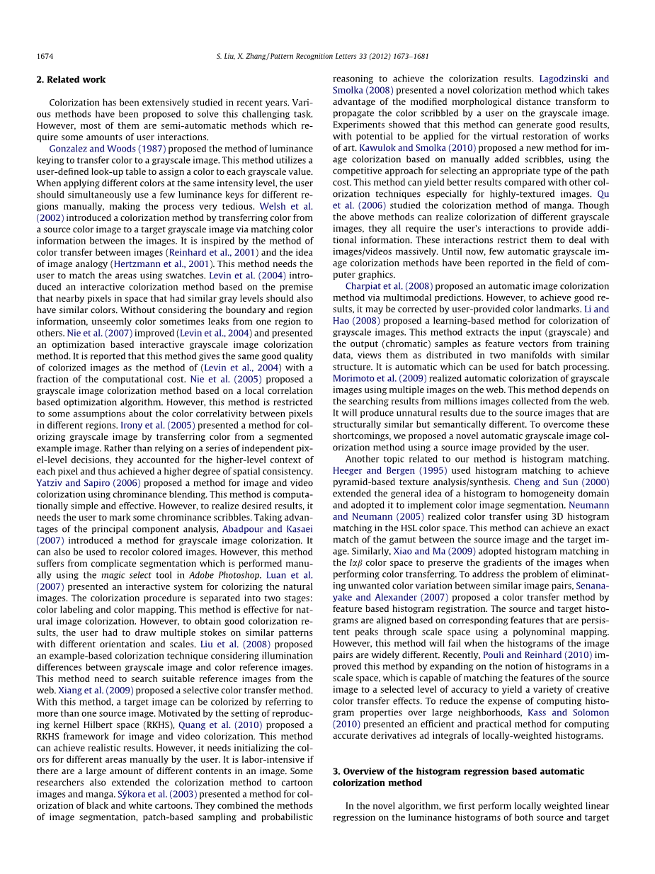 本文的其余部分组织如下。在第二部分,介绍我们的算法的框架。第三部分给出了对相关工作简要的调查。然后我们在第四部分给出了图像局部加权回归的方法。第五部分提出了零点调整和匹配的方法。第六部分讨论了灰度图像的加权彩色化过程。第七部分介绍了彩色化的评价方法。在第八部分讨论实施和结果。本文也包括了结论和未来的工作。