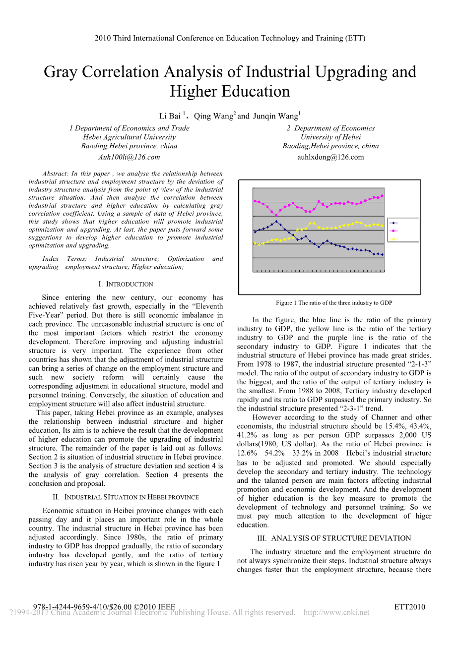 本文以河北省为例,分析产业结构与高等教育之间的关系,研究表明:随着高等教育的发展,产业结构优化的水平也在提升。本文的结构安排如下:第二部分介绍河北省产业结构发展现状,第三部分是结构偏差分析,第四部分是灰色关联度分析。第五部分介绍结论和建议。