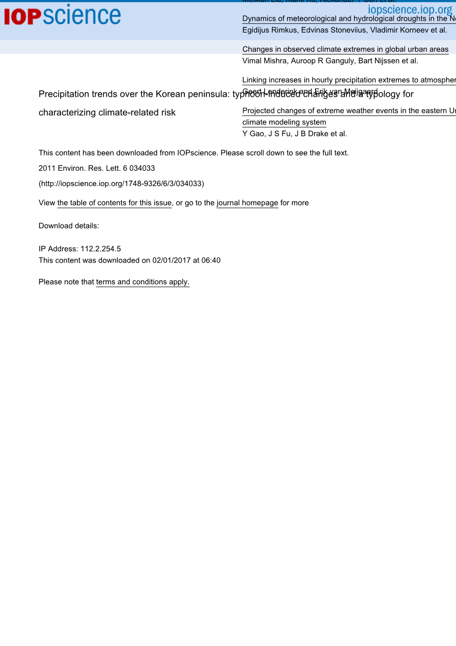 最近有研究报道夏季朝鲜半岛的强降水频率有增加的趋势,以及季节性降水总量也显著增加(Jung等2002,常和权2007,裴某等2008,Jung等2011)。极端降水事件是非常重要的,不仅因为它们的阶段性影响,例如洪水,而且对季节性淡水供应也有着显着的贡献,以此来维持人类和自然系统的完整。