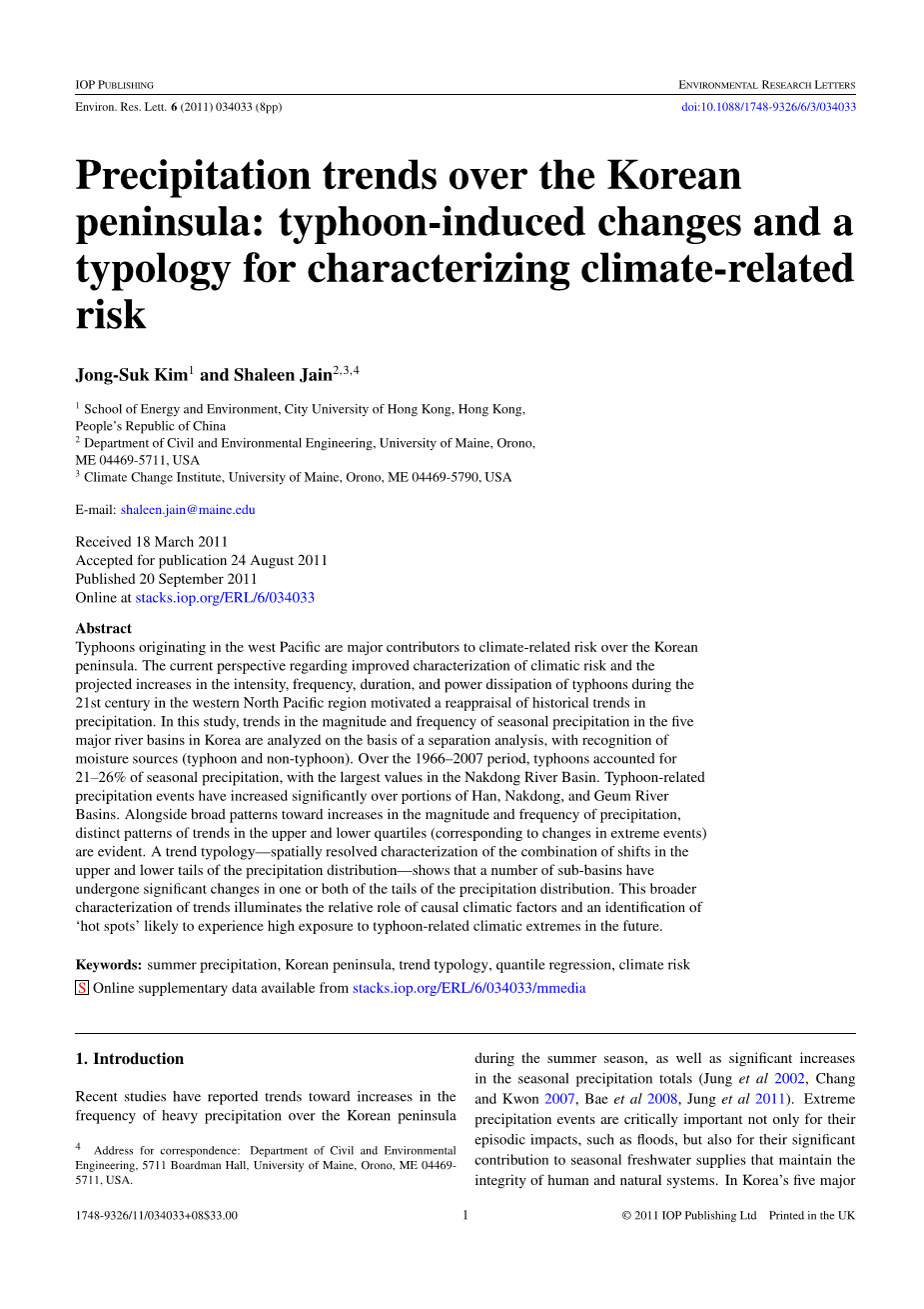 大多数强降水事件集中在夏季,其中一部分还遇到了北太平洋西部的台风季。(例如,Kim等2010)。在1995 - 2004年期间,台风造成朝鲜半岛的财产损失占总损失的69%(NAK 2011)。 在2002年,台风鲁萨造成50亿美元的财产损失和266的人员伤亡(Lee 2007)。此外,目前对二十一世纪晚期的多模式预测表明北太平洋西部地区台风的关键属性有所增加(以20世纪后期基线的百分比变化)(Emanuel 等2008,Knuston等 2010): 强度( 10.8%),频率( 5.5%),持续时间( 2.7%)和功率耗散( 19.1%)。