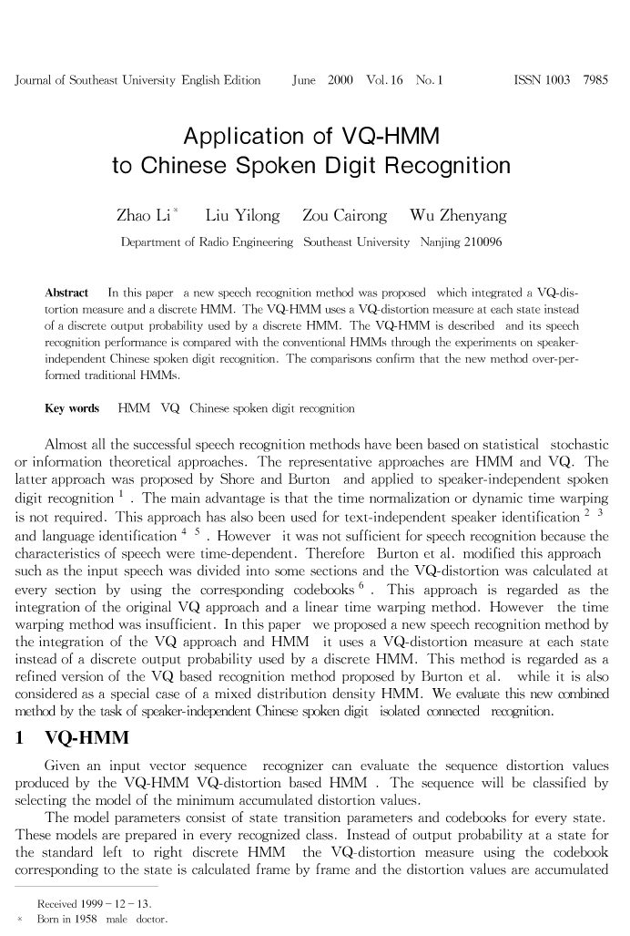 几乎所有成果的语音识别算法已经被记录了,是随机或信息理论方法。其中最具有代表性的是HMM和VQ。最新的理论是由Shore和Burton提出的,并且被用于数字语音识别。它的主要优势在于静态时间或者动态时间的扭曲是不作要求的。这个方法同样被用于身份识别和语言识别。但是,它对于语音识别不是很有意义因为语音识别要求具有时间依赖性。因此,Burton等人,改进了这种方法,例如把语音分成不同的部分,通过VQ算法相应的码本计算每个部分,这种方法被认为是VQ算法和线性算法的整合。但是,时间扭曲方法是没有意义的,在这篇文章中,我们提出了一个新的语音识别算法通过整合VQ和HMM算法,它使用一种VQ失真算法代替了原来通过离散HMM算法计算的离散输出部分。这种方法被认为是在Burton提出的语音识别算法为基础上的精良版本,同时它也被认为是HMM的一种特殊的混合分布密度方法。我们通过使用汉语语音识别验证了这种方法。