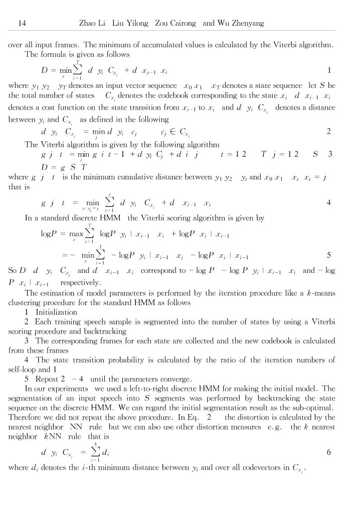 在我们的实验中,我们使用一种从左到右的HMM离散法来制作原始模型。通过回溯状态来执行将输入语音分割成S段序列。我们可以将初始分割结果视为次优。因此我们不用重复上述程序。在第二步中,失真通过最近的NN法则,但是我们可以使用另外的失真方法,例如k最近的NN法则就是: