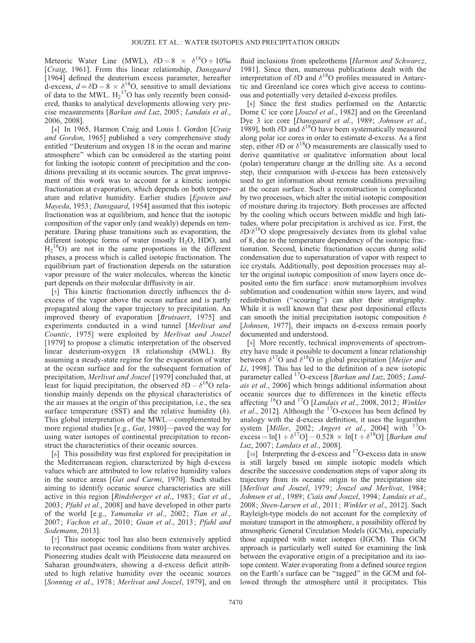 引用: Jouzel, J., G. Delaygue, A. Landais, V. Masson-Delmotte, C. Risi, and F. Vimeux (2013), Water isotopes as tools to document oceanic sources of precipitation, Water Resour. Res., 49, 7469–7486, doi:10.1002/2013WR013508.