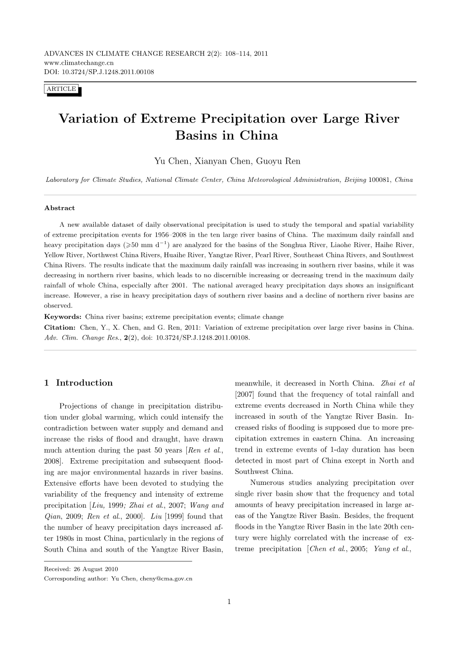 近50年来全球变暖下降水分布变化的预测可能加剧供水矛盾,增加供水和供水风险引起了广泛关注[Ren et al,2008]。 极端降水和随后的洪水是河流的主要的环境危害。研究了极端降水频率和强度变化的广泛用途[刘,1999;翟等,2007;王和钱,2009;任等,2000]。Liu[1999]发现,中国大部分区域内,特别是南中国以及长江以南地区,1980年代以来,大量降水日数增加,同时华北也有所下降。翟等[2007]发现,长江流域南部地区,华北地区降水总量和极端事件频数均有所下降。淹水风险增加的原因是中国东部地区降水极端恶化。中国大部分地区除了中国西北和西南地区,一直持续1天的极端事件日益增加。