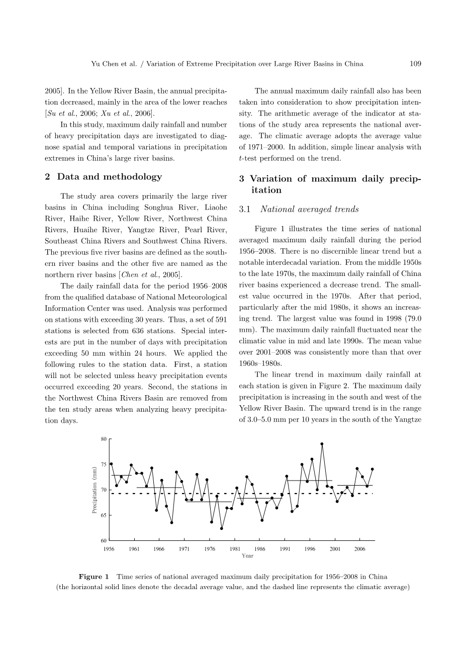 - 最大的日强降水量南部河流流域有增加的趋势,北部河流流域下降,特别是2001年以后明显下降。