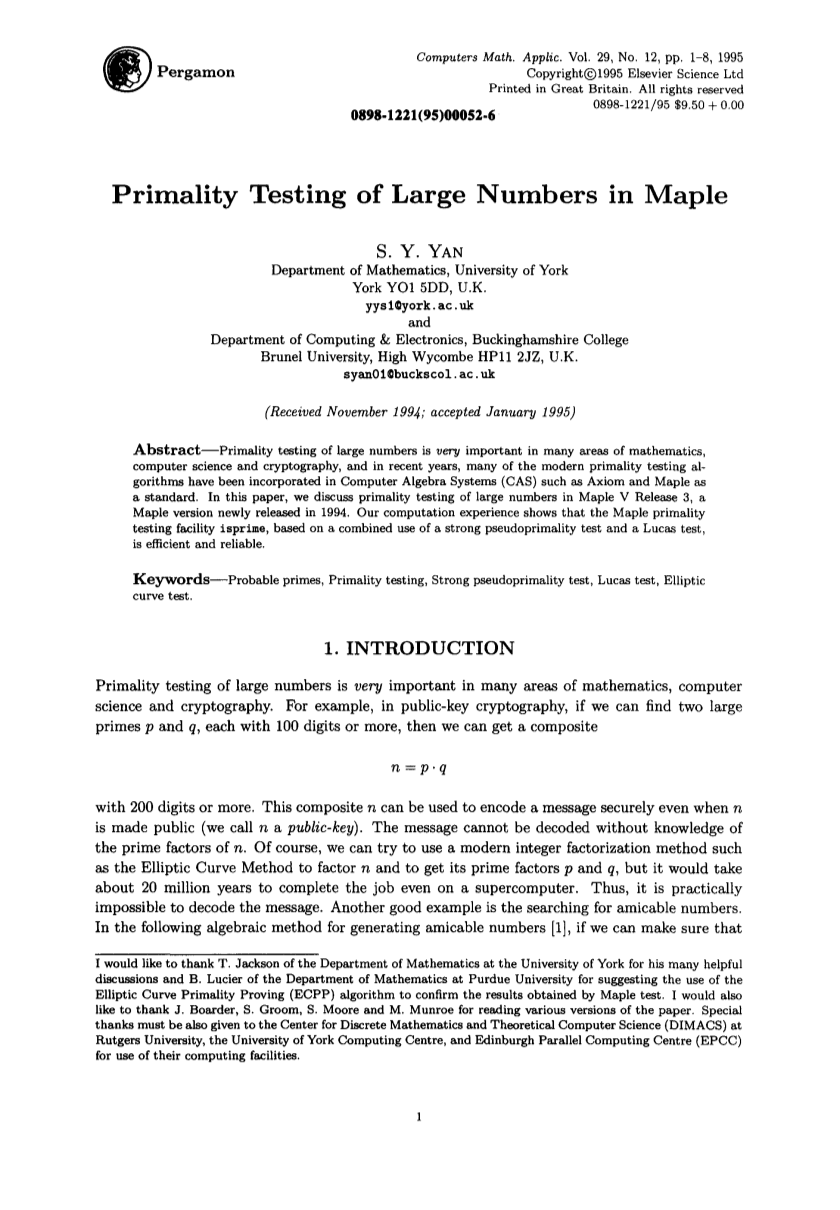 maple是一个非常强大的计算机代数系统开发符号计算,在滑铁卢大学和科学计算研究所产生。它可以操作数学公式,数字理论,代数,几何,三角学,微积分和组合。在这一部分,我们只关心在maple素性测试设备的数字理论,以前的版本(即版本1和2)Maple V的素性测试设备是否素数只使用一个强大伪素数试验,所以一些伪质数和卡迈克尔数通过素数测试,在剑桥测试的下列数字。