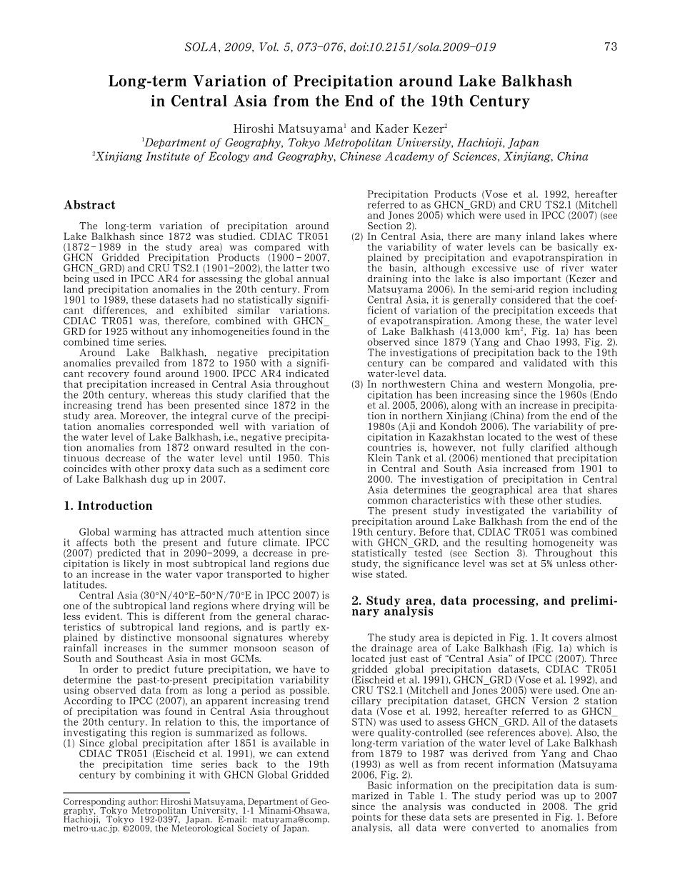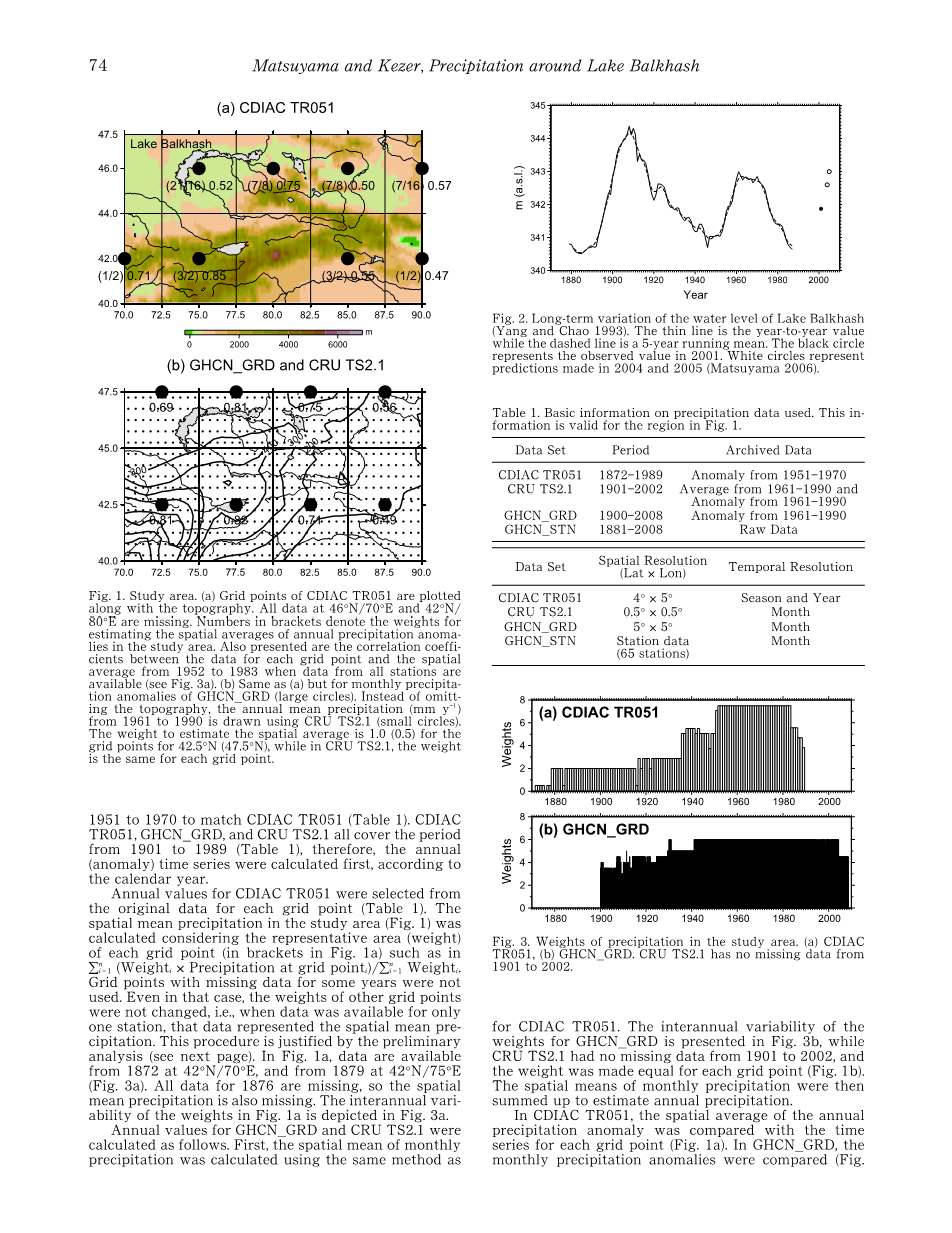 研究了巴尔喀什湖周围1872年以来降水的长期变化。将CDIAC TR051(1872-1989年在研究区内)与GHCN网格降水产品(1900-2007,GHCN_GRD)和CRU TS2.1进行比较,后两者被用于在IPCC第四次评估报告中对20世纪全球年陆地降水异常的评估。从1901年到1989年,这些数据集没有统计学上的显著差异,反而表现出类似的变化。因此,CDIAC TR051关联1925年的GHCN_GRD产品,没有在组合时间序列中发现任何的不均匀性。
