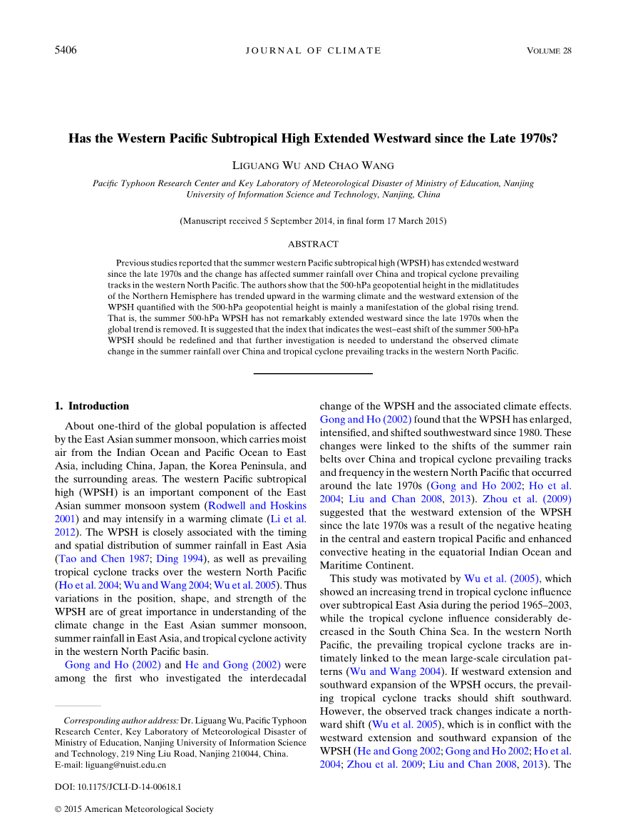 摘要:前人的研究表明夏季西太副高从20世纪70年代末期开始西伸,而且这种变化对中国的夏季降水和热带气旋的移动路径有重要影响。作者认为,温度升高会使北半球中纬度500hPa等压面上的位势高度增加,因此,西太平洋副热带高压在500hPa位势高度场的西伸主要是这种全球性的等压面抬升在该地区的表现,也就是说,当不考虑全球位势高度增加趋势时,夏季500hPa西太副高在20世纪70年代末期并没有发生明显的西移。这表明500hPa夏季西太平洋副热带高压的东西偏移的指数应该被重新定义,因此,需要进一步研究以认识西太平洋副热带高压对我国夏季降水与西北太平洋热带气旋活动的影响。