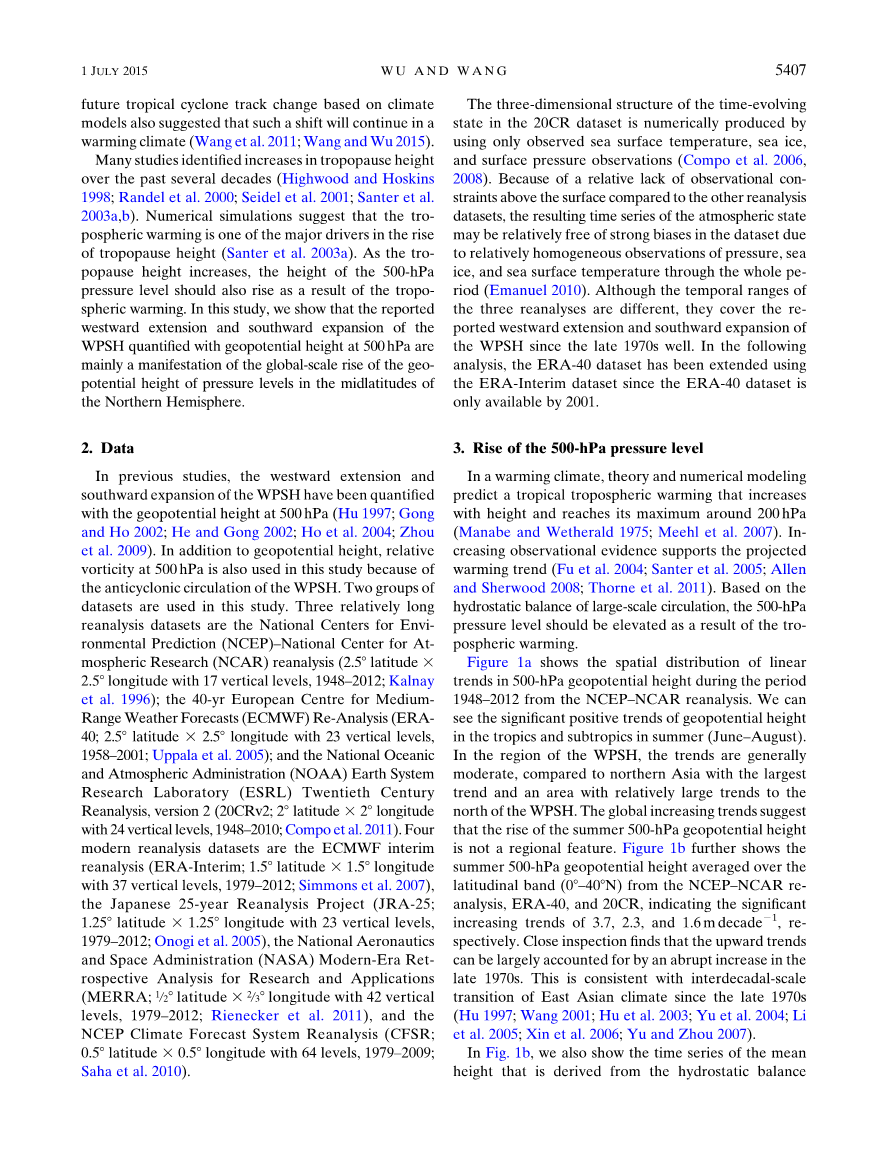 20CR再分析资料是最新的一套综合性全球大气环流的数据集,时间覆盖范围是从1871年到现在,时间分辨率有6小时、日平均、月平均可选,它仅同化地面和海平面的气压数据,并用观测的月平均海表面温度和海冰作为下边界驱动条件。虽然三个再分析资料的时间范围是不同的,但它们均涵盖了自20世纪70年代末以来西太平洋副热带高压的西伸和南压。 在下面的分析中,ERA-40数据集已经使用ERA-Interim数据集进行扩展,因为ERA-40数据集仅在2001年后可用。